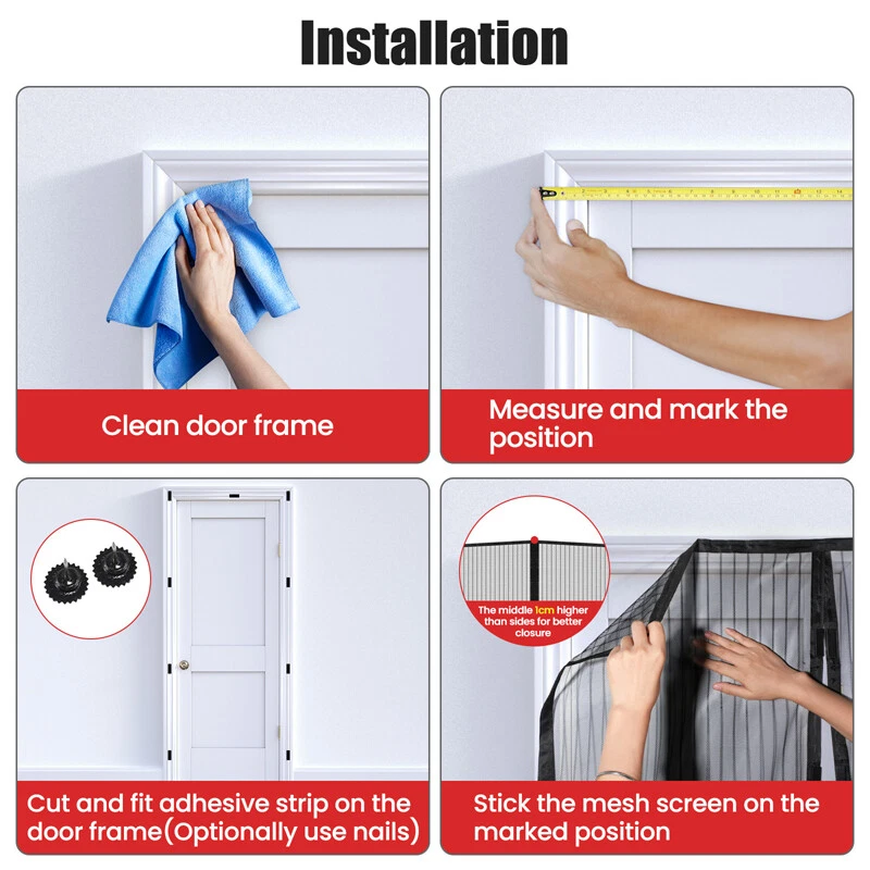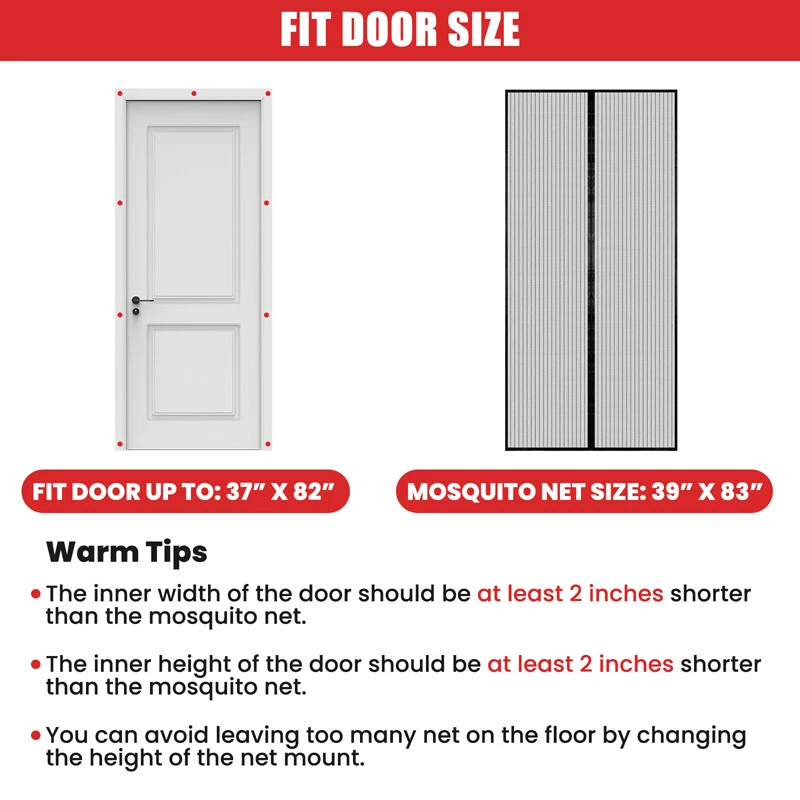 Magnetic Screen Door Mesh Curtain Durable Heavy Duty Mosquito Net Bug Hands Free Feature: -- Anti-mosquito Protection: Anti-mosquito door curtains help keep insects, mosquitos and flies out, allowing fresh air to circulate when closed. -- Human and Pet Friendly: Made of polyester material, children and small pets can easily enter and exit the house. -- Easy to Install: Installs in seconds without any tools, folds up for easy storage, long-lasting use and easy removal. -- Durable Design: This door net is made of heavy-duty mesh with reinforced double stitching on the sides, which is tear-resistant and can withstand thousands of uses. -- Security Screen Door Mesh: Upgraded screen door magnets, fully reinforced edges, with thumbtacks and stickers for extra security, perfect for single doors, sliding doors, French doors. Specification: Colour: Black Material: Polyester Size: 100*210cm/39.4*82.7inch Package includes: 1x Door Curtain 10x Sticks 20x Studs 1x Installation Instructions Payment Delivery details Terms of sales About us Contact us Payment Payments: Paypal, Google Pay, Visa, Master Card, Amerian Express, Discover. Delivery details All items are shipped from US warehouse located at NJ . We ship to your eBay or Paypal address. Please make sure your eBay or Paypal address is correct before you pay. Terms of sales Free return About us Pls contact our customer service firstly if have any problems , we will help to solve the issue, and could offer free return service for full refund or free replacement after confirming. You can buy from us with confidence Contact us If have any problems, please feel free to contact us.