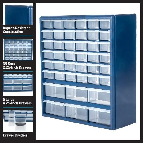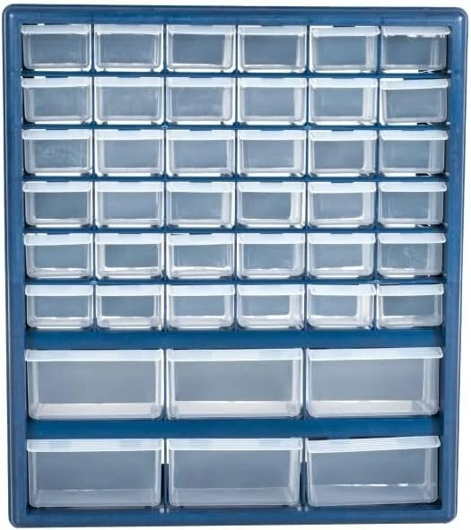 Number of Items in Set: One-Piece Special Features: Portable Number of Compartments: 42 Batteries Required?: No Item Depth: 6 in gtin13: Does not apply Batteries Included?: No Type: Drawer Box Item Weight: Less Than 2 lb Number in Pack: 1 Global Trade Identification Number: 00844296010837 Frame Material: Plastic Included Components: Item And Manual Item Package Quantity: 1 Product Dimensions: 6.3"d X 15.8"w X 18"h Item Width: Plastic Storage Drawers Capacity: 41 - 80 Quarts Color: Blue Material: Polypropylene, Plastic Size: Medium Style: Storage Drawers Mounting: Wall Mounted, Desktop Item Length: Plastic Storage Drawers Shape: Rectangle Number Of Drawers: 42 Brand: Unbranded Item Height: Plastic Storage Drawers Features: With Compartments, Portable UPC: Does not apply Personalize: No