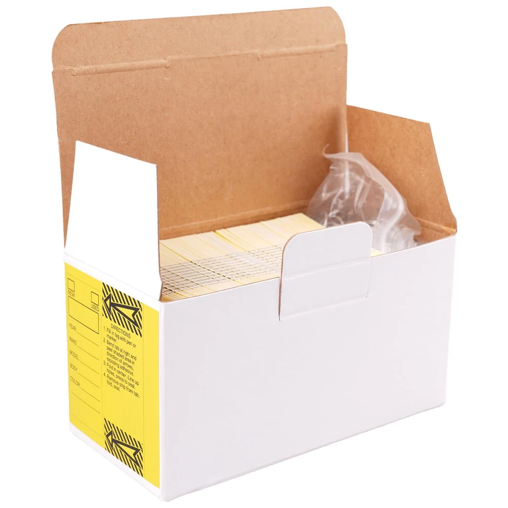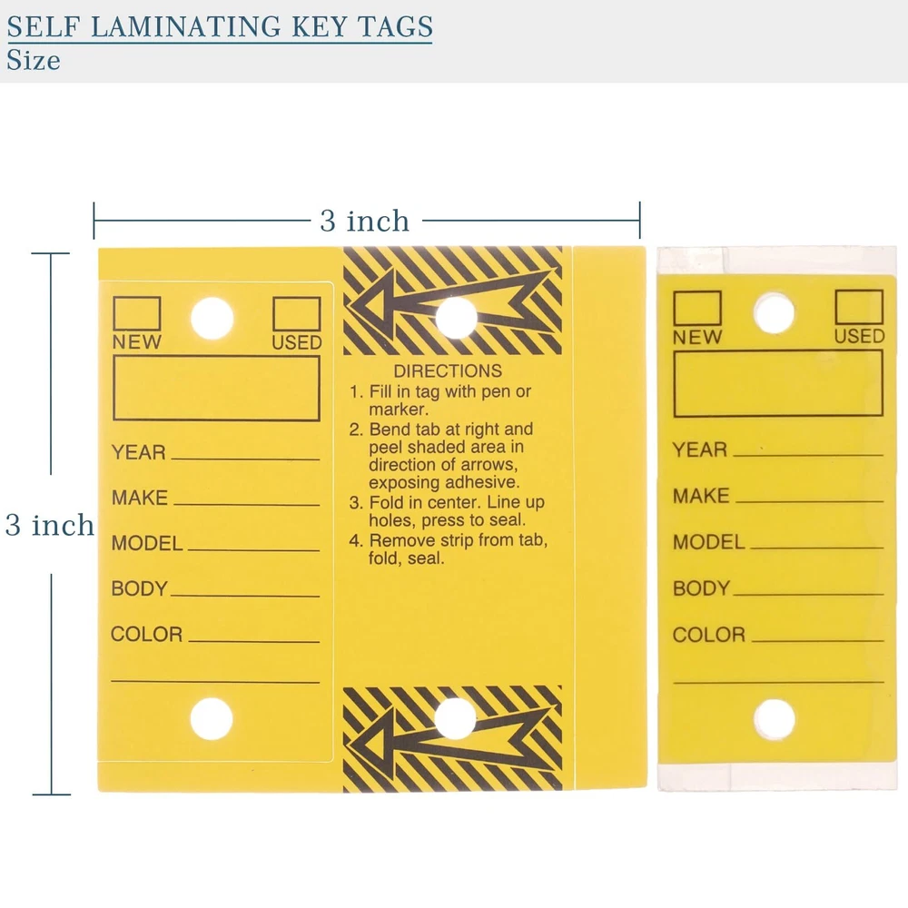 Self Laminating Key Tags 250 Pcs with 250 Rings Per Pack - Yellow | Bulk Car Dealership Supplies Car Key Tags Self Protecting | Versatile Premiun Quality Genuine Key Tags Cardboard Tags Multi-use 【Color】Yellow 【Size】3x3 inch 【What You Get】250 Pcs Writable Self laminating Key Tags with 250 Pcs Rings 【High Quality and Durable】Crafted from premium materials, these self-laminating key tags are designed to withstand daily wear and tear. Perfect for automotive, home, or office use, ensuring your keys are always organized and easy to identify. 【Waterproof and Weather-Resistant】 These key tags are waterproof, making them ideal for both indoor and outdoor environments. The self-laminating design protects the label from moisture, ensuring long-lasting clarity and readability. 【Easy to Use and Customize】 Each tag features a writable surface, allowing you to label your keys clearly. Simply write, peel, and seal for a secure, tamper-proof label. No additional tools or equipment needed for assembly. 【Versatile and Practical】 Ideal for organizing car keys, luggage tags, or office keys. The included metal rings provide a secure attachment, preventing tags from getting lost or misplaced. Suitable for personal and professional use. 【Cost-Effective Bulk Pack】This pack of 250 key tags offers exceptional value, ensuring you have enough tags for all your needs. Perfect for car dealerships, real estate agents, or anyone looking to keep their keys neatly organized.