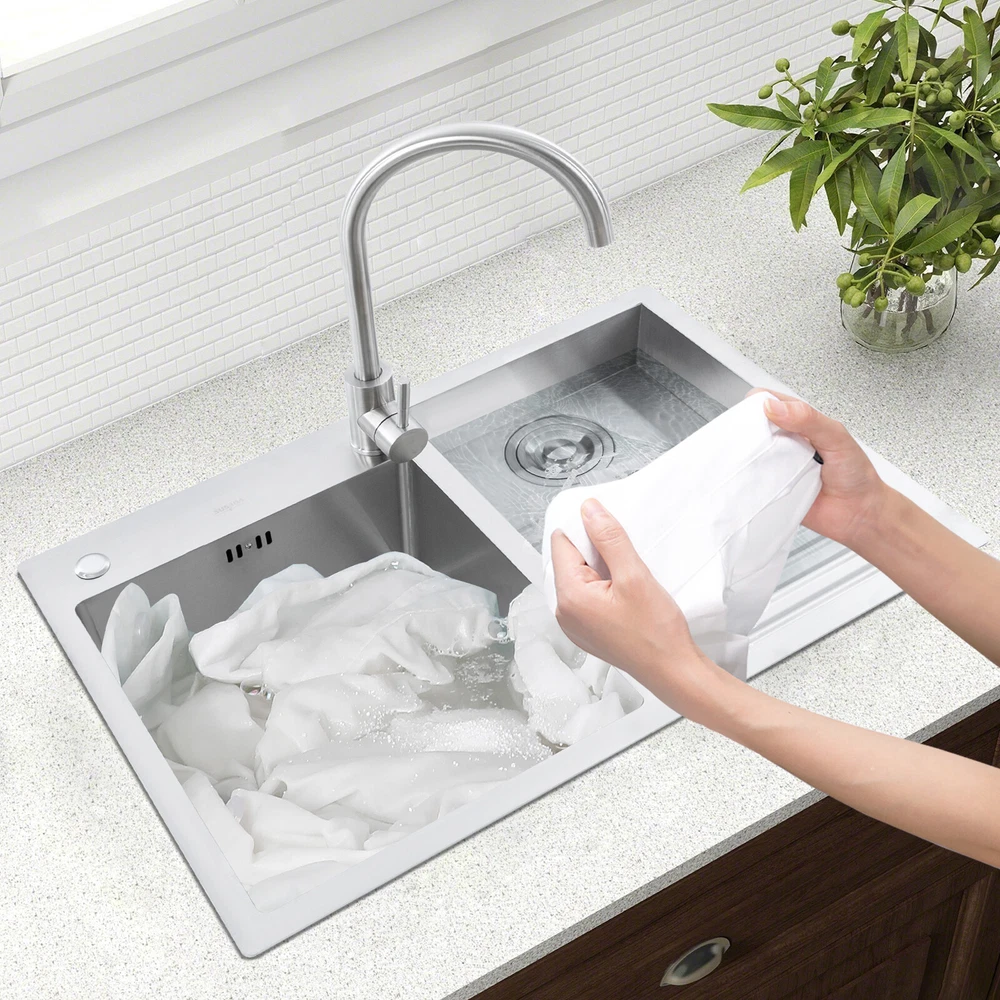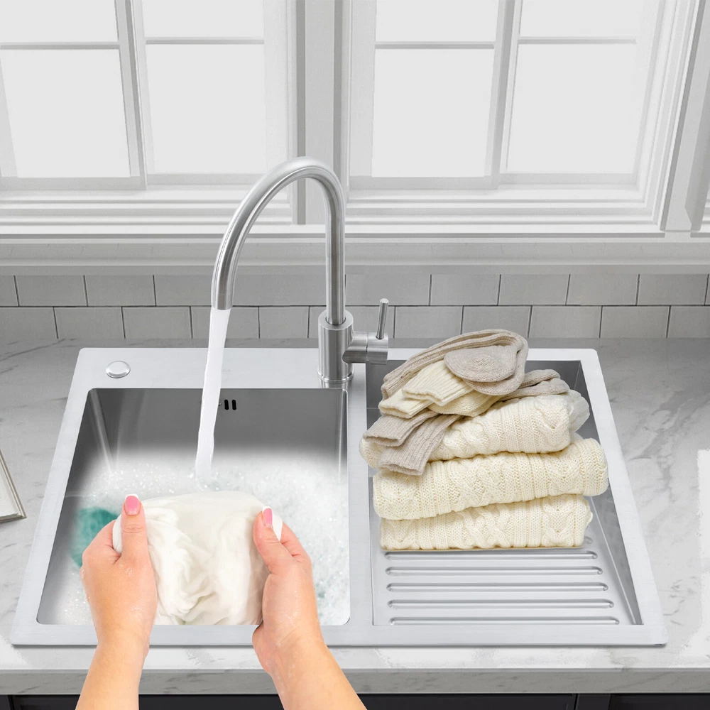 Drop-In Stainless Steel Double Bowl Kitchen, Bar and Laundry Utility Sink Description An Exceptional Laundry Sink Can Greatly Enhance the Washing Experience, Making It an Elegant Ritual in Life. It Is Not Only a Practical Assistant in Household Labor but Also an Indispensable Part of Home Aesthetics. with Its Durability and Functionality, the Well-selected and Cleverly Designed Laundry Sink Turns the Tedious Cleaning Work into a Leisurely Time. Package Included 1* Laundry Sink 1* Faucet 1* English and Chinese Manual All Accessories for Installation Key Features Build to Last: the Laundry Sink Is Mainly Made of 304 Stainless Steel with a Wire Drawing Process, with High Hardness, Wear Resistance, and Impact Resistance , so It Can Be Adopted in some Humid Environments Such As Laundry Rooms and Kitchens. 2-in-1 Design: the Product Adopts a Double Basin Design. on the Left Side, There Is a 13.31*14.8*8.66-Inch Laundry Basin That Allows You to Easily Soak, Rinse, and Scrub Large Clothes, While the Tilted Wave Washing Board on the Right Effectively Removes Stubborn Stains and Helps You Quickly Clean Clothes. Quick Drainage: the X-shaped Water Guiding Lines and Two 4.33-Inch Diameter Drains Allow You to Drain Water Quickly and Easily. in Addition, the Washboard with a Slope Design Is Easy to Use and Optimizes Drainage. Nice Partner: the 360° Rotatable Faucet with 2 Hoses Can Connect Cold and Hot Water, Allowing You to Use Water at a Suitable Temperature Throughout the Year While Ensuring Easy and Thorough Cleaning. Thoughtful Design: It Has an Additional Acoustic Pad on the Bottom to Eliminate Excess Noise and Vibration, Creating a Quiet Kitchen, Laundry, or Utility Room Environment for Your Family. Meanwhile, the Anti-condensation Layer Prevents Moisture Buildup from Damaging Kitchen Cabinets. Easy to Clean: the Smooth Stainless Steel Surface Can Be Kept Clean by Wiping It with a Soft Cloth and Neutral Soap. the Round Corner of the Basin Eliminates the Dead Corner of Dirt Accumulation for Easy Cleaning. the Drainage Strainer Intercepts Food and Debris for Easy Disposal and Prevents Clogging. Fashionable Appearance: the Smooth Silver Surface Makes It Look Modern and Fashionable, and Can Blend with Different Decorative Styles to Add a Touch of Decoration to Your Space. Simple Installation: Complete Installation Accessories, a Simple Structure, and a Detailed Chinese and English Manual Allow You to Complete the Assembly in a Short Time. Pre-drilled Holes: the Pre-drilled Holes on the Product Make It Easy for You to Install the Faucet. Overflow Holes: the Anti-spill Holes Can Reduce the Risk of Overflowing Water to Avoid Wasting Water and Soaking the Floor. Round Edges: Smooth, Burr-free Edges Are Not Only Comfortable to Touch but Also Prevent Scratching Your Skin and Clothes. Application It Applies to Laundry Rooms , Bathrooms, Garages, Basements, Balconies, Courtyards, Gardens, Etc. Specification Color: Silver Style: modern Shape: rectangular Assembly Required: Yes Material: 304 Stainless Steel Process: Wire Drawing Mounting Type: Drop-in, Top-mount, or Under-mount Left Basin Size: 33.8*37.6*22cm/13.31*14.8*8.66in Right Washboard Sink Size: 43.2*29cm/17.01*11.42in Each Drain Diameter: 11cm/4.33in Interface Size of Water Inlet Pipe: 1/2" Product Size: 70*48*22cm/ 27.56*18.9*8.66in Package Size: 76*53.5*27cm/ 29.92*21.06*10.63in Drop-in Installation Suggested Countertop Opening Size: 67*45cm/26.4*17.7in Undermount Installation Suggested Countertop Opening Size: 66*44cm/25.6*17.3in Gross Weight: 11kg/24.25lbs Net Weight: 10kg/22lbs Notes Please Measure the Opening Size of the Base Cabinet in Advance so That the Item Can Be Installed Smoothly. Please Read the English Installation Manual Carefully Before Use and Pay Particular Attention to the Safety Instructions Contained Therein. Please Allow the Slight Color Difference Caused by the Shooting Light and the 1-3 Cm Error Due to Manual Measurement, and Make Sure You Do Not Mind Before Ordering. Payment Delivery details Terms of sales About us Contact us Payment We accept ebay payment 。 Fees such as import duties, taxes are not included in the item price or shipping costs. These charges are the buyer's responsibility. Delivery details Shipping: 2-9 working days to: USA Terms of sales We maintain high standards of excellence and strive for hundred percent customer satisfaction. Feedback is very important to us. We hope that you contact us immediately before you give neutral or negative feedback, so that we can address your concerns. It is impossible to address issues if we do not know about them! About us Your satis faction is our ultimate goal. We work hard to earn your trust and future business. Our certified technicians have tested each item before shipping. The unit comes with 1 year limited warranty on all manufacturing defects. a) If you receive a defective item, you may return it or ask for a discount. Please contact us within 14 days after you receive the package. b) What you returned must be intact and in its original packaging as re? u. Customer is responsible for shipping costs of the returned item. c) We will cover the cost of shipping back t with the shipping rate indicated in the registration page. We will send you a new unit or refund the full payment you paid. Thank you. Contact us Business Hour Business Hour: Monday To Friday: 8:30 AM to 5:00 PM (Beijing China time) Due to time zones, our reply to your questions may not be immediately. But within above working time, we will reply your email within 24 hours. If it's non-workdays, please kindly be patient and wait till Monday. Please contact us with ebay message. Please feel free to contact us if you have any questions. Monday To Friday: 8:30 AM to 5:00 PM (Beijing China time) Due to time zones, our reply to your questions may not be immediately. But within above working time, we will reply your email within 24 hours. If it's non-workdays, please kindly be patient and wait till Monday. 