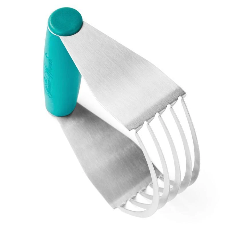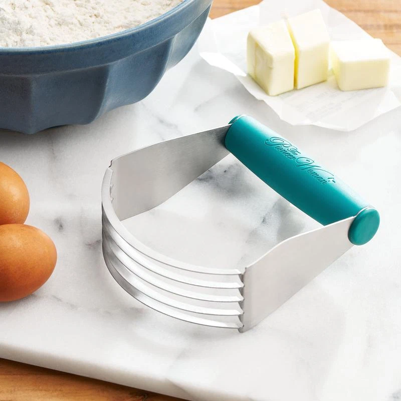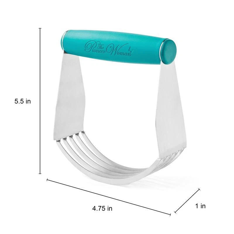 Meet your new baking companion—The Pioneer Woman Stainless-Steel Pastry Dough Cutter in Teal. This dough cutter is designed with a comfortable plastic handle that makes blending butter, margarine, and other ingredients into your pastry dough effortless. Its sturdy u-shaped blades are crafted from high-quality stainless steel, allowing you to cut through dough with ease and achieve the perfect texture for pie crusts, biscuits, and other baked goods. The stainless-steel construction ensures durability, making it a versatile tool for all your baking needs. After you're done baking, cleaning is a breeze—just pop it in the dishwasher, and it's ready for your next culinary adventure. Additionally, it's BPA-free, giving you peace of mind while you bake. This Pastry Cutter is compact and easy to store, yet robust enough to handle heavy-duty baking tasks. Experience the difference a high-quality dough cutter can make and elevate your baking with The Pioneer Woman Pastry Dough Cutter today! Meet Ree: Ree Drummond is a NY Times Best Selling Author, TV personality, social media phenom, and the woman behind the popular Pioneer Woman lifestyle blog that started it all. She's also a lover of butter, basset hounds, Ethel Merman, her hunky, cowboy husband Ladd, and their four kids. Her casual country style and delicious recipes have made her a go-to for all things cooking and entertaining. The Pioneer Woman Stainless-Steel Pastry Dough Cutter, Teal: Made of durable stainless steel and plastic handle Effortlessly blends butter, margarine, and other ingredients into pastry dough Five sturdy U-shaped blades provide ease in cutting through dough for perfect pie crusts, biscuits, and other baked goods Compact and easy to store Ergonomically designed handle for a secure and comfortable grip Dishwasher safe BPA free Measures: 5” L x 1” W x 5. 5” H Features: Ergonomic Handle Brand: The Pioneer Woman Color: Teal blue Manufacturer Part Number: PW55069605140AC Material: Stainless Steel Assembled Product Weight: 0. 3 lb Model: PW55069605140AC Assembled Product Dimensions (L x W x H): 1. 80 x 4. 60 x 5. 50 Inches