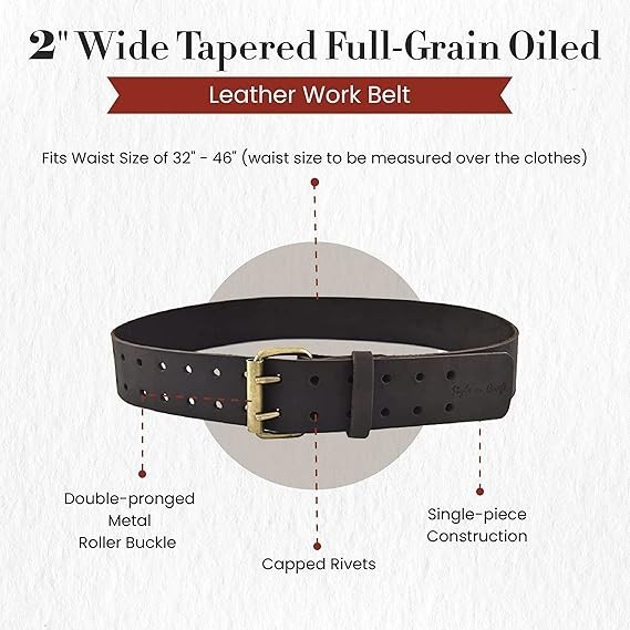 Style N Craft Work Belt, Durable and Rugged Belt Innovative Work Belt: Made with heavy full-grain oiled leather, this Style n Craft work belt is stylish and durable. The work belt is a single-piece leather belt with no stitching, which gives the belt a trendy and unique look. Sturdy Construction: An ideal belt for all workers, this work belt is 2" wide and uses a single piece of thick full-grain oiled leather for extra strength, longevity, and durability. Amazingly Compatible: This belt is perfect for carrying tool pouches, accessories, and framer's pouches for heavy workloads. With its special design, the belt doesn't sag, ensures mobility, and provides bending comfort. Adjustable Work Belt: The ergonomic and unique construction of the leather work belt makes it easy to adjust during long working sessions. The belt comes in one size and can easily fit a waist size of 32" - 46" (measure waist size over clothes). Stylish Work Belt: Available in dark brown color, this work belt features a heavy-duty double-pronged metal roller buckle and capped rivets for safety. All its metal hardware has an antique finish for a premium appearance.