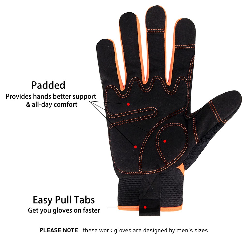 Touch screen work gloves compatible for your phone and touchscreen devices without having to take the gloves off Durable & reinforced mechanic gloves with synthetic leather palm provides strength, safety, and quality Adjustable wrist strap ensures the perfect fit for safety and comfort Foam palm padding and foam knuckle padding for protection and safety Flexible stretchable spandex back construction gloves make your hands cool and dry Double-stitched synthetic leather reinforcements on palm, saddle and fingers working gloves for maximum durability. Palm :Synthetic Leather with foam padded Back: Spandex & Polyester Cuff: Neoprene Size: Medium, Large,XL Medium: 10*22cm / 3.9"*8.7" Large: 10.5*22.5cm / 4.1"*8.8" XL: 11*23cm / 4.3"*9.1" Type: Men & Women utility work gloves Due to manual measurement, it's allows 1-3(cm) discrepancy Please Note: These work gloves are design by men size. could run large for women, please contrast the Size Chart in the picture 6th before order. Flexible & Breathable Work Gloves: Stretchable spandex design back keep your hands cool and comfortable on the job. Please Note: These work gloves are design by men size. could run large for women, please contrast the Size Chart in the picture 6th before order. Touch Screen Work Gloves: With 3 Touch screen compatible fingertips capable for your phone or tablet without having to take the gloves off. Terry Cloth On The Thumb: More convenient to wipe your face and sweat away while staying focused on the task at hand. Utility Work Gloves with Padded Palm & Knuckle: Synthetic leather palm with foam padding provides hands better support & all-day comfort, gives extra protection from vibration & impact while allowing flexibility. Easy On, Easy Off:Supportive neoprene cuff with with hook& loop strips closure cuff for snug secure fit.