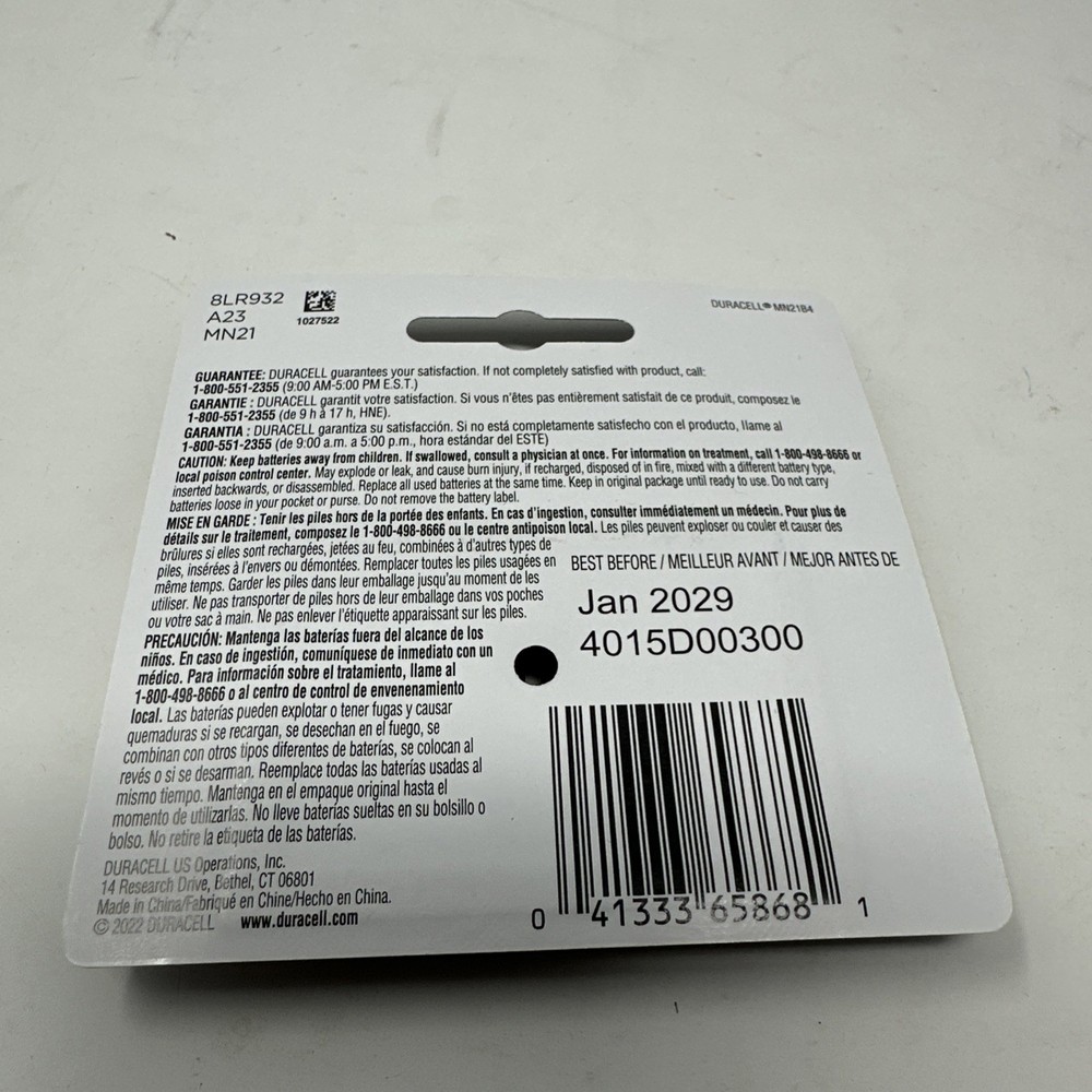 The Duracell 21/23 CopperTop Alkaline Batteries 12V (MN21B4PK) are 12V block batteries with a capacity of 0.8 Ah. These batteries have a height of 0.45 inches and a depth and width of 3.5 inches, making them suitable for various devices that require a 12V power source. The Duracell brand is known for its reliable and long-lasting batteries, making these alkaline batteries a dependable choice for powering a range of electronics and tools. Expiration is January 2029 (18) Expiration August 2029 (53) Expiration December 2028 (47)