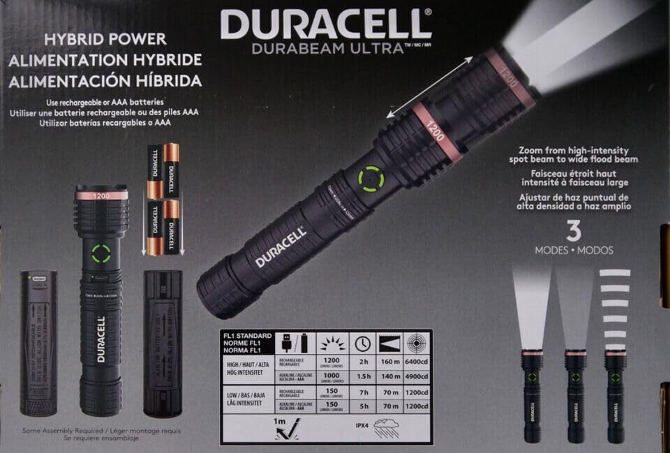 DURACELL Durabeam Ultra Hybrid LED Flashlights, 1200 Lumens, Set of 3, with Illuminate your path with the Duracell ULTRA HYBRID 1200 Lumens Rechargeable LED Flashlight 2 Pack. Designed for versatility and durability, these flashlights emit a powerful 1,200 lumens, casting a bright beam up to 140 meters away. The sleek black aluminum and plastic construction ensures they withstand the elements, while the included batteries mean you're ready to go right out of the box. Enjoy the convenience of handheld illumination that lasts; these flashlights offer operating times of 5-10 hours on a single charge. The durable design is rated IPX4, making them waterproof for use in all your outdoor adventures. Each pack contains 3 flashlights, each with a length of 7 inches, ensuring you're well-equipped for any nighttime excursion. Fast and Free Shipping You're already purchasing the item. Why pay additional for shipping, especially slow shipping? We get your order shipped out within 1-business day and delivered to your doorstep as quickly as possible. Competitive Pricing With our dynamic pricing model, our prices are always competitive. Our prices are some of the lowest that you will find on the internet. Rest assured that you're getting a good deal when purchasing with us. 30-day Money Back Guarantee We are committed to making sure that you leave this transaction satisfied. If you're unhappy with the product for any reason, you may return it back for your money-back or a replacement within 30 days. No questions asked!