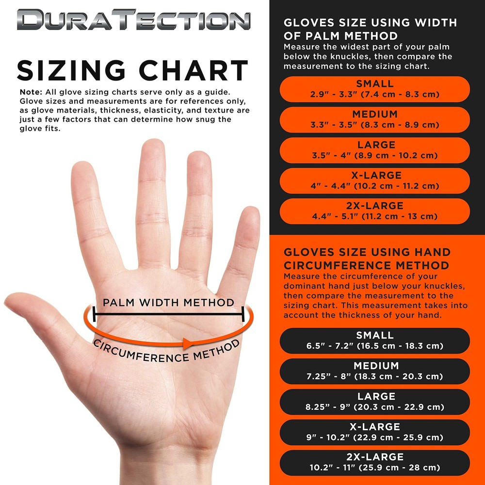 Duratection 8 MIL Orange Super Duty Diamond Textured Nitrile Disposable Gloves, 3 Boxes of 100, Medium-Sized. Super strong, extra-thick 8 mil nitrile gloves with superior puncture resistance against cuts, snags, and abrasions for maximum safety protection. They offer incredible stretch with no tearing or pinching. See our glove sizing chart image to determine your correct glove size Raised Diamond Texture: Comfortable, snug-fitting ambidextrous gloves with a fully enhanced raised diamond textured grip that provides a superior grip on wet, dry, slippery, and oily surfaces. The raised diamond texture means more surface area to channel away grease and liquids, giving you a firmer non-slip grip on tools and other objects. Super Duty Safety Protection: Extra-thick gloves that are designed for heavy-duty tasks, providing durable barrier protection against grease, oil, and other petroleum-based chemicals. Latex-free, powder-free, and chemical-resistant nitrile gloves that are ideal for use by those who are allergic to natural rubber. The gloves have bare-hand sensitivity, so you can wear them when handling touchscreen phones and touch-sensitive devices. High-Visibility Orange: These bright neon orange gloves are easy to see in light or dark working environments, which increases your safety while wearing them. Gloves are available in sizes M, L, and XL. The Brand is part of a trusted worldwide company that has been in business for nearly 50 years Versatile: Our durable safety protection gloves are worn worldwide in the most common home or workplace environments. The gloves are safe for food handling, food service, sanitation, exams, home, automotive, mechanical, industrial, manufacturing, workshop, painting, chemicals, tattoo artists, salon professionals, and schools, indoors and outdoors.