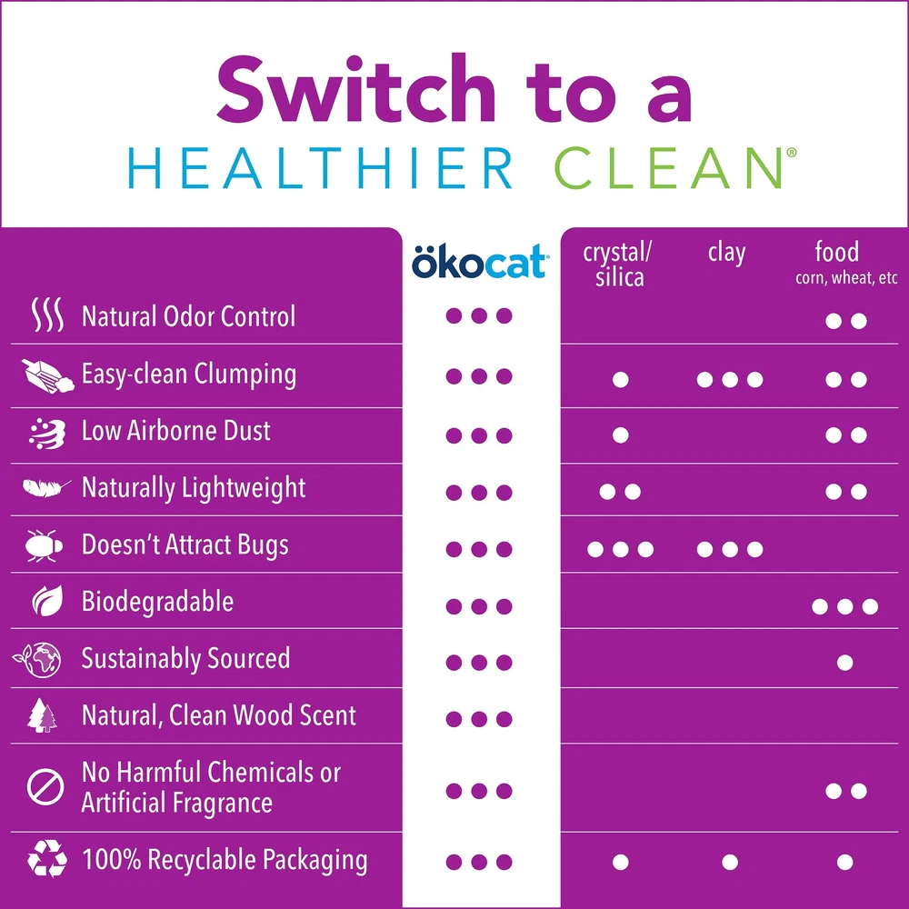 Spend less time sweeping with this premium natural litter that's cleaner and healthier for your cat, family and home. less mess clumping litter is made from dense, mini-pellets that are soft on paws, and less likely to scatter out of the litter box or track through the house like finer litters. It's also a great choice for long hair cats. is relentless at controlling odor, along with a fresh natural scent reminiscent of the great outdoors. Made entirely from sustainably sourced, responsibly rescued natural wood fiber, offers the brilliance of European engineering for a better performing litter without added fragrance, synthetic chemicals, dyes or GMOs. öko is German for eco or ecological, meaning green or organic. all natural cat litter is made from 100% reclaimed wood that comes from the earth and can be returned to the earth since it's completely biodegradable, unlike clay litter. Keep the spaces you share with your cat healthy and clean, without dirty clay dust or additives. Next generation plant-based cat litter that's cleaner and healthier for your cat, family and home with mini-pellets that are less likely to scatter out of the litter box. LITTER THAT LASTS LONGER: Fast and furious absorption means no liquid ever gets to the bottom of the litter box. With regular scooping, litter can last up to 7 weeks. NATURALLY LIGHTWEIGHT: Easy lifting, pouring and disposal. NO artificial fragrance, NO synthetic chemicals, NO dyes, NO GMOs BIODEGRADABLE & FLUSHABLE: Made from sustainably sourced, responsibly rescued natural wood fiber that can be safely returned to the earth. Just scoop & flush one clump at a time. CLUMPS SOLID FOR EASY SCOOPING: Precision-cut fiber absorbs liquid on contact to form solid clumps for easy scooping & cleaning. 99% DUST FREE FOR A HEALTHIER HOME: Clean wood fiber is screened & de-dusted for a cleaner pour. No dirty clay dust. STOPS ODOR BEFORE IT STARTS: Wood fiber naturally prevents enzymes from bonding with liquid & waste to stop the creation of ammonia & odor.
