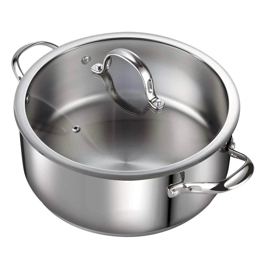 The 7-Quart Classic Stainless Steel Dutch Oven Casserole Stockpot with Lid is made with 18/10 stainless steel with an aluminum disc layered in the bottom. The aluminum disc bottom provides even heat distribution and prevents hot spots. Tempered glass lid with steam hole vent makes viewing food easy. Stainless steel riveted handles offer durability. Induction compatible. Works on gas, electric, glass, ceramic, etc. Oven safe to 500F, glass lid to 350F. Dishwasher safe. Well Made: 7 quart dutch oven is made of 18/10 stainless steel, which is resistant to corrosion, high temperatures, and deformation Even Heating: Dutch oven features an impact-bonded aluminum disc in the bottom; The aluminum core ensures quick, even heat distribution with no hot spots Multi Purpose: Dutch oven pot with lid 7 quart great for soups, making sauces, stews and noodles Ergonomic handle: Stainless steel pot equipped with tempered glass lids and steam vent that allow steam to escape for viewing food while cooking; Riveted stainless steel handle with air flow technology is durable, comfortable to hold and stays cool Compatible with All Stovetops: Dutch oven pot works on induction, gas, electric, glass, ceramic, and more; Dishwasher safe and oven safe up to 500℉
