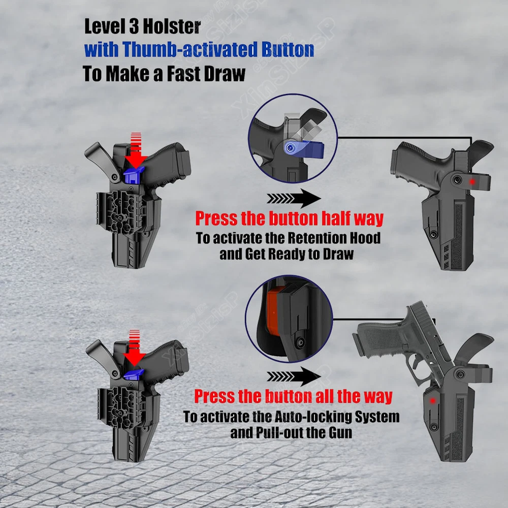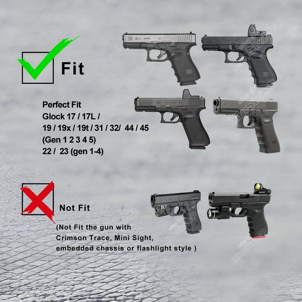 High Quality Military & Police Grade Polymer OWB Holster Specially Designed For Fast Draw During Duty Or Shooting Competition. Weapon Compatibility - Outside Waistband Tactical H olster with Drop Leg H olster Fit Glock 17 (Gen 1-5) 9mm Glock 17L (Gen 1-3) 9mm Glock 19 (Gen 1-5) 9mm Glock 19X 9mm Glock 22 (Gen 1-4) (.40 S&W) (Not fit Gen 5) Glock 23 (Gen 1-4) (.40 S & W) (Not fit Gen 5) Glock 31 (Gen 1-5) (.357 SIG) Glock 32 (Gen 1-5) (.357 SIG) Glock 44 (.22 LR) Glock 45 9mm ( Without laser, embedded chassis, or flashlight style. ) Level 3 retention duty gun holster features two locking systems: The thumb-activated retention hood and the Auto-locking system; - The Thumb-activated retention hood slides over the rear of the gun to lock it into place. - Auto-locking system will automatically lock and hold your firearm safely once holstered. Quick Holster Mounting: Quick mount the holster on the drop leg platform or detach it from the platform. This drop leg tactical holster comes with the quick-mounting system that allow the users to attach(detach) and lock the holster on the drop leg platform quickly while adjusting the ride hight. Make a natural Fast Draw & Retention Adjustment: The thumb-activated button of these two locking systems is right in the position where your thumb will naturally come to rest as you acquire your shooting grip to activate and make a natural quick draw. You can make your ideal retention by simply adjusting the retention screw. No rattles with this holster. Drop Leg Platform Features: 1. Perfect platform size with fully adjustable double leg straps conforms to any leg size; 2. The double leg straps feature silicone strips for non-slip traction and each leg strap has a little part of elastic for comfortably bending, squatting, kneeling, jogging, running, sitting, driving, etc; In the Package: · 1*Holster with Paddle Attachment and straps · 1*Allen Key Shipping: Ships same day or next except Sundays and Holidays ! Free shipping! Ship by USPS First Class Package. 100% MONEY BACK GUARANTEE. Any question please be free to contact with us .Thanks!