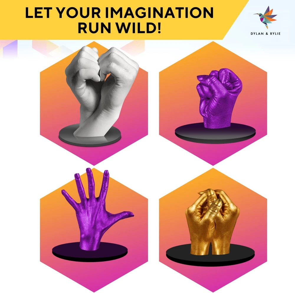 Preserve Every Precious Detail: Our hand casting kit for couples with base ensures each line and fingerprint is preserved with exceptional precision, creating a lasting memory of your bond. Complete Hand Molding Kit for Couples: This plaster hand mold casting kit includes everything you need—molding powder, casting stone, wood base, card stand, and more—making it an ideal gift for weddings, anniversaries, and other special occasions. Easy and Enjoyable Crafting Experience: No experience required! The hand mold kit couples comes with easy-to-follow instructions and video tutorials, ensuring a seamless and enjoyable crafting experience for couples. Ideal for Celebrating Special Moments: Celebrate your love and milestones with a unique and heartfelt activity. This keepsake hand casting kit is a perfect gift for adult couples for couples activities, anniversaries, Valentine's Day, birthdays, and more. Thoughtful and Ready-to-Gift Packaging: The Dylan & Rylie hand casting kit is packaged beautifully, ready to be gifted to your loved ones. It can also be a family hand casting kit, making it a meaningful and cherished present for loved ones on any special occasion. Product Description