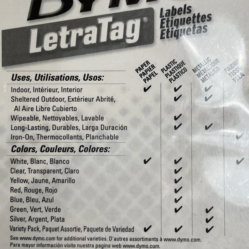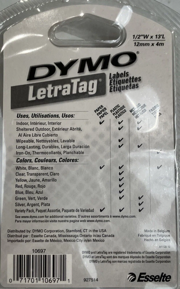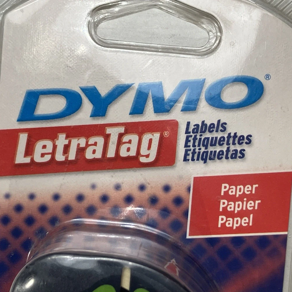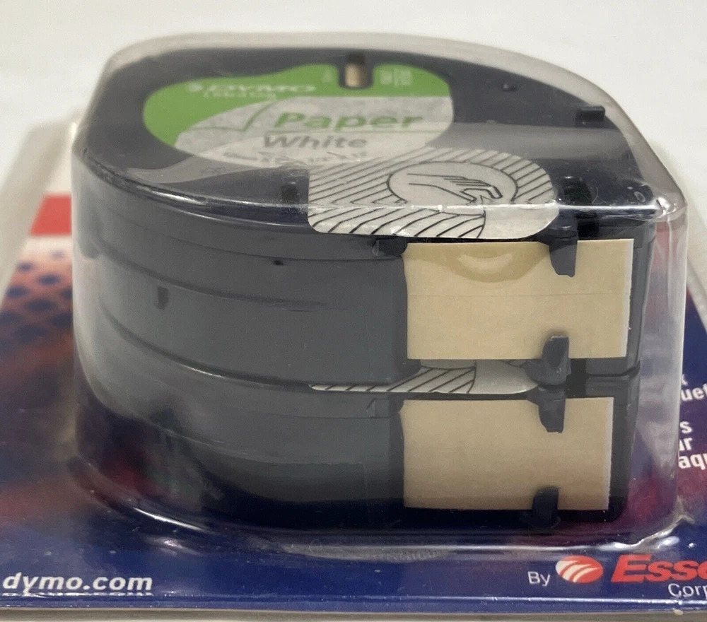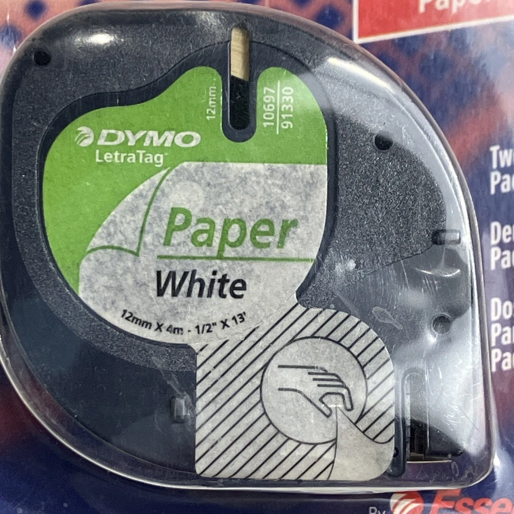 Dymo Label Refills white paper 10697 2 Pack for LetraTag NOS Made in Belgium To upcycle, I reuse shipping material as often as possible. Buy more from my store and save on shipping. Stick it to folders, books, personal items, and even retail items with this Dymo 10697 LetraTag Paper Label Tape refill. The Dymo 10697 is compatible with Dymo LetraTag label printers. To make your labels, just type in the text that you want to include. You can enter capital or lowercase letters as well as numbers. The thermal ink on your labels is fade-resistant even if you use the labels in a sunny location or place the labels outdoors. No water or ink is needed, which means that the printing will not smear if you touch it as soon as it comes out of the Dymo label maker.This efficient Dymo office printer cuts the label close to the edge of the printing. This helps you to get as many prints as possible from each roll of the white plastic refills. The printing is in black, providing you with enough contrast to easily read the label's information. The font size of the writing is 0.375 inches tall. These helpful makers also have a built-in date and time function so that you can save money by not throwing out usable label tape supplies. Each label tape measures about 13 feet long, so you will have plenty of labels for everything in the home or office. These labels also have convenient peel-and-stick adhesive backings, making them easy to affix to anything you choose. You may even attach the completed printouts onto fabric in order to brand coats, clothing, backpacks, lunchboxes, and items in hospitals and nursing homes. This Dymo LetraTag label tape also works on adhesive papers plus plastic bins and plastic organizers, allowing users to tag the contents of any container. The labels are terrific for marking supplies. If you want to label frozen food containers, just stick the printout on the freezer packaging before putting your food into the freezer. If you need to use the Dymo LetraTag tape on a reusable container, the original LetraTag label can be removed. No residue will be left behind on your storage containers. You can then put a new label on the container, and it will reliably stay put.Organize your file folders, make sure your roommates know which food in the fridge is yours, or put pricing labels on items for sale in a small shop quickly and easily. These printouts can also be used to categorize your paper office supplies. You can also use these black-on-white Dymo tapes to label plastic furniture. These durable tape accessories can be wiped clean with a damp cloth if they get dirty. The cassette and the maker accessories may be stored at room temperature after you're done using them.When it comes time to reload the tape cassettes, you can do so quickly and effortlessly during the printing process. Just push out the old reel and affix the new one into place. The Dymo LetraTag will be ready immediately for more printing. With these easy-to-use Dymo label tapes, you can enjoy an organized home and office.