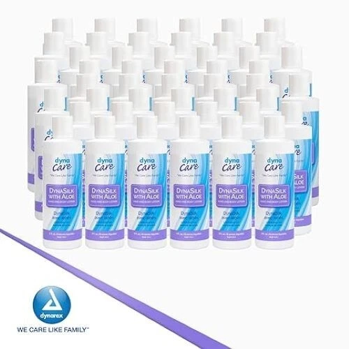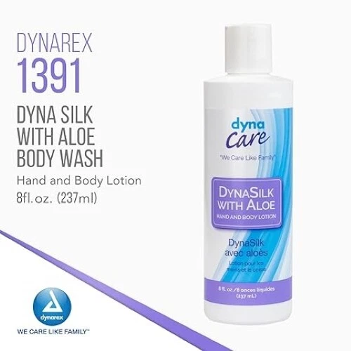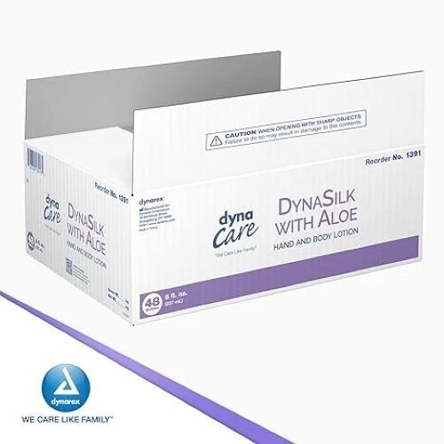 DynaSilk with Aloe Hand & Body Lotion is formulated with aloe vera to help moisturize dry skin. Quantity per Case: 48 Formulated with aloe vera gel to help soothe dry skin Non-greasy formula can be used on hands and body Fresh, clean scent Ideal for use in hospitals and long-term care Not made with natural rubber latex