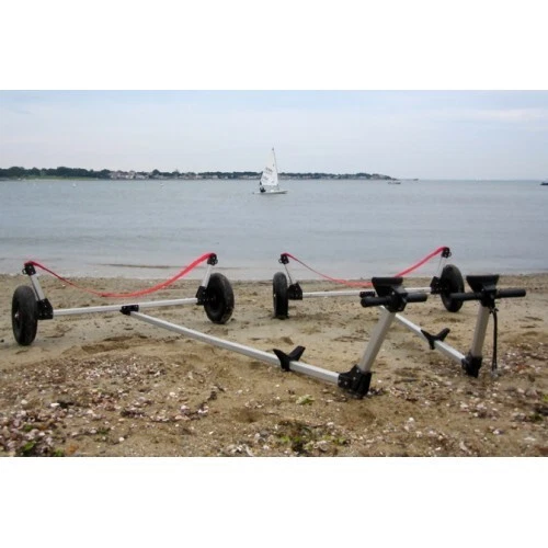 DYNAMIC DOLLY, Laser 12002, TYPE 2 Dolly style allows bow of boats with a curled gunwale to hang from a specifically shaped handle fitting. Snug-fitting edge trim atop the handle fitting protects the gunwale gelcoat. Type is suitable for Laser, Byte, Gig Harbor 16, and more. Boat-specific tube and sling lengths provide a custom fit for each boat, enabling a balanced handle load and easy maneuvering. All joint fittings are through-bolted and designed for increased torque stability. Strong, 3” non-stretch, polyester sling provides wrap-around boat support. Adjustable, flexible V-fitting on tongue tube provides boat support forward of the sling and prevent boat and aluminum contact. Eyelets on sling and handle fittings facilitate securing boat to dolly in storage, on trailers or in racks. Tie-down with the handle fitting eyelet helps prevent slippage on steep ramps. Easy dolly breakdown using the snap buttons on wheel shaft and tongue tube, as well as wing nuts on axle tube cross fitting. Pneumatic, non-corrosive, 16” x 4” wheels can be secured on wheel shaft with provided screws for added security. For soft sand conditions, tire pressure can be reduced to increase tire footprint.
