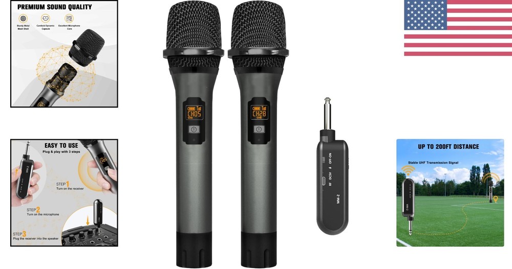Dynamic Dual Handheld Microphone Set with Rechargeable Receiver for PA Systems ‹ › ‹ › ‹ › ‹ › ‹ › ‹ › ‹ › ‹ › ‹ › ‹ › ‹ › Dynamic Dual Handheld Microphone Set Rechargeable Receiver for PA Systems Key Features: UHF Wireless Technology: Designed for superior signal integrity, the UHF wireless microphone minimizes interference, ensuring high-quality performance without disruption. Stable Signal Transmission: With 15 frequency options for each channel and a robust 200 feet stable signal distance, this dual-channel system allows 15 sets of microphones to operate simultaneously without interference. Premium Sound Quality: Equipped with a professional-grade chipset, enjoy crystal-clear sound reproduction with built-in noise reduction features that enhance every performance, whether for singing, karaoke, speeches, weddings, meetings, or live shows. Effortless Setup: Plug and play functionality with automatic pairing makes it easy to use, simply connect the 1/4” MIC jack to your preferred devices like karaoke speakers, power amplifiers, and PA systems - please note it is not suitable for phones and computers. Rechargeable & Durable: The portable receiver features a rechargeable battery with a quick 2-3 hour charging time, offering up to 6 hours of continuous use. Its aluminum alloy construction ensures it is both sturdy and lightweight. Contents: Included in this set: 2 x Handheld Microphones 1 x Rechargeable Receiver with 6.35mm Plug 2 x Anti-Slip Rings 2 x Mic Covers 1 x USB Charging Cable 1 x User Manual Why Choose Our Dynamic Dual Handheld Microphone Set? This dynamic dual microphone set is tailored for those who demand excellence in sound clarity and performance. Ideal for both casual and professional settings, it promises reliability and top-tier audio quality, making it the perfect addition to any karaoke gathering, party, event, or live performance. Experience the magic of music and speech with unparalleled clarity and convenience - order your Dynamic Dual Handheld Microphone Set today! Shipping Free & Fast Shipping - We offer free shipping to most of the USA with a normal delivery time of 3-7 days. However, due to the current situation, additional delivery time (up to 3 weeks) may be required for some items. Alternative Carriers - We may use alternative carriers (e.g. USPS, FedEx, UPS, etc.) to ensure your package arrives safely and on time. Due to the use of multiple carriers, we are unable to provide a tracking number automatically. Handling Time - Orders are processed and shipped within 1-2 business days of receiving cleared payment. Shipping Restrictions - Shipping to Alaska, Hawaii, Puerto Rico, Guam, and other US territories may incur shipping charges or delivery restrictions. Please contact us before ordering, or your order can be refunded/cancelled. State Restrictions - There may be restrictions based on your state of purchase. For example, certain items may not be shipped to California due to state regulations. Contact for Tracking Updates - If you require tracking updates or have any concerns about the delivery of your order, please feel free to contact us, and we will be happy to assist you. Return 30-Day Hassle-Free Returns - We want you to be completely satisfied with your purchase. If you are not, you can return the item within 30 days of receiving it for a full refund or exchange. Easy Return Process - To start a return, simply contact us and we will provide you with a prepaid return shipping label and detailed instructions. Restocking Fee - There are no restocking fees for returns. However, the buyer is responsible for return shipping costs if the return is not due to a seller's error. Refund Processing Time - Refunds will be processed within 5 business days of receiving the returned item in its original condition. Payment We accept all major credit cards, PayPal, and Apple Pay for your convenience. Your payment information is secure and encrypted to ensure a safe and seamless transaction. Please complete your payment within 3 days of purchase to avoid any delays in shipping. Feedback Your feedback is extremely important to us. We strive to provide the best products and customer service possible. If you are satisfied with your purchase, please take a moment to leave us a positive review. If you have any concerns or issues with your order, please contact us before leaving negative feedback. We are committed to resolving any problems and ensuring your satisfaction. Contact Us If you have any questions or concerns, please feel free to reach out to our customer support team. You can contact us through the eBay messaging system. We are available Monday to Friday, 9:00 am to 5:00 pm EST, and we will do our best to respond to your inquiry within 24 hours. Buy it now and enjoy a pleasant shopping experience! UPC: Not Set Maximum SPL: 70 dB Unit Quantity: 1 Item Weight: 0.83 kg Connectivity: 6.35 mm (1/4 in) TS,UHF Features: Plug and Play,UHF Wireless Microphone,Stable Signal Transmission,Premium Sound Quality,Easy to Use,Rechargeable & Durable,Battery Indicator Light Brand: Unbranded Form Factor: Handheld Transducer Type: Dynamic Model: Not Set Diaphragm Size: Medium Suitable For: Karaoke MPN: Not Set Unit Type: Unit Color: Black Polar Pattern: Unidirectional Country/Region of Manufacture: Not Set Mount Type: Not Set Manufacturer Warranty: Not Set Compatible Brand: Not Set Compatible Model: Not Set