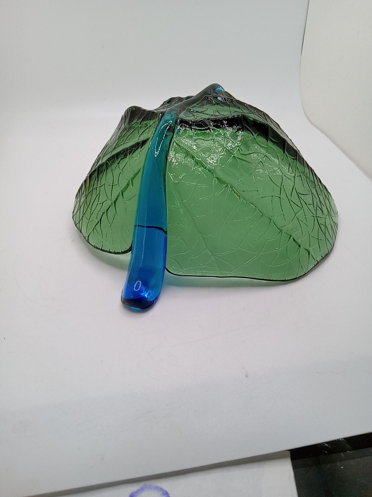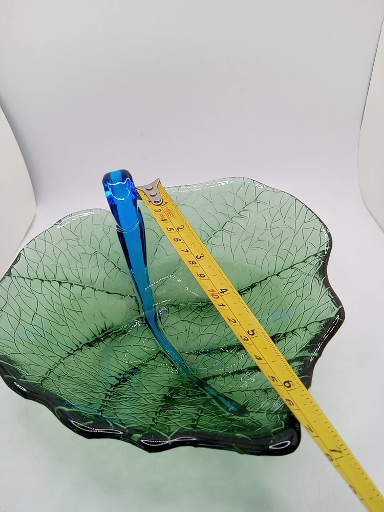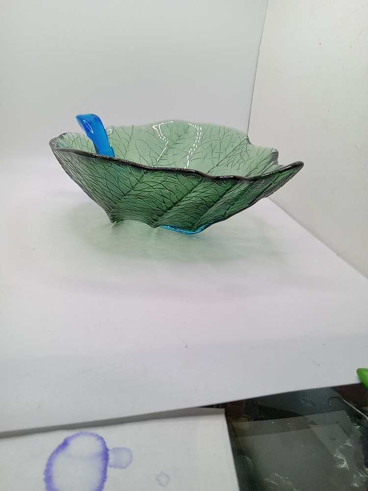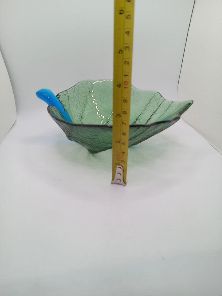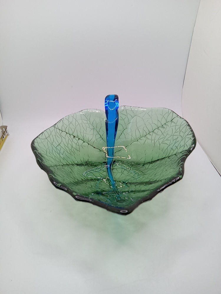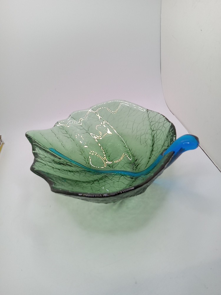 Department: Adults Shape: Grape Leaf Pattern: Leaf Material: Glass Item Depth: 6.5 in Type: Serving Bowl Occasion: All Occasions Item Height: 2.8 in Character: N/A Features: Blue Stem Country/Region of Manufacture: Unknown Brand: Gallery Theme: Floral And Fawna Finish: Shiny UPC: Does not apply Item Width: 7.5 in gtin13: Does not apply Style: Vintage/Retro Color: Green MPN: Does Not Apply