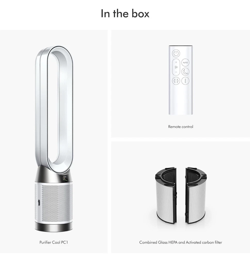 Remote Control: Yes Voltage: 120 Features: HEPA H13 grade filtration | Smart home purification | Captures 99 Machine Width: 8.03in Type: Purifier In the Box 1: Combined Glass HEPA and Activated carbon filter Item Width: 7.5 Dimensions (inches) (HxWxD): 41.34x8.03x4.72in Machine Height: 41.34in Item Height: 40 Brand: Dyson In the Box 2: Remote control Machine Length: 4.72in Number of Speeds: 10 Material: Plastic Model: PC1 Dimensions (HxWxD): 41.34x8.03x4.72in