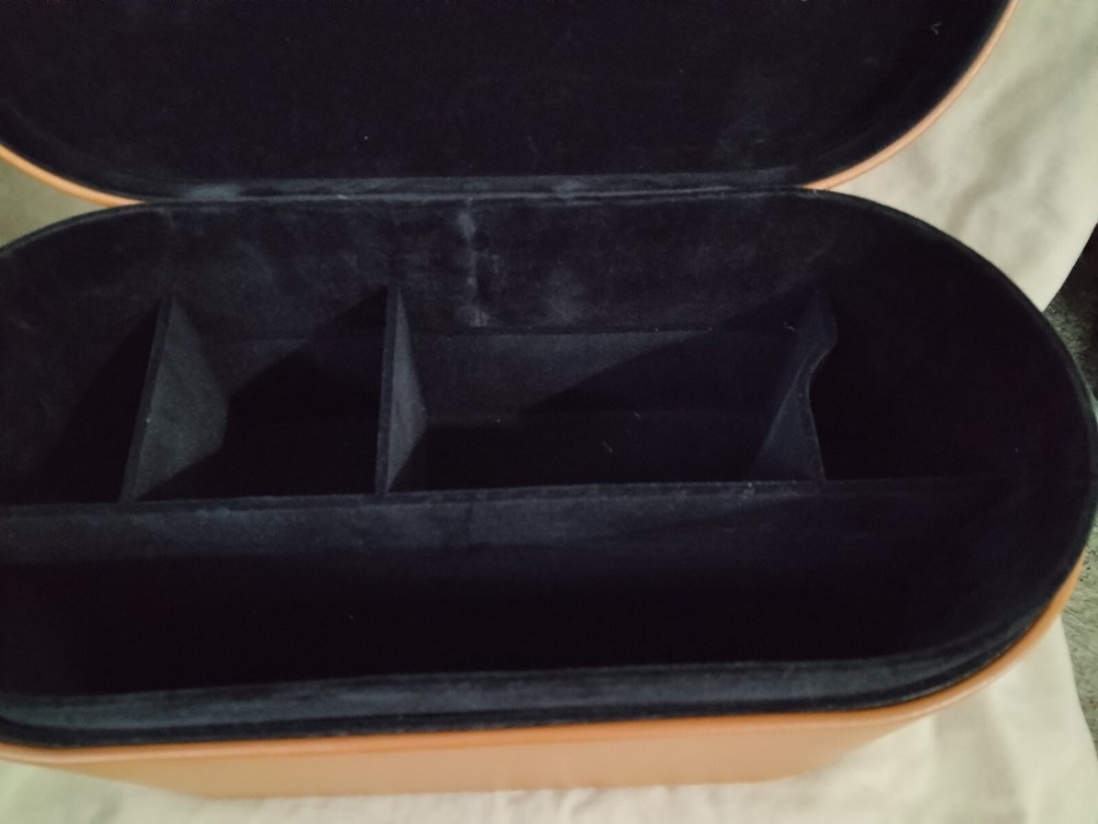 THIS IS A DYSON AIR WRAP STORAGE CASE IT IS LEATHER AND IN EXCELLENT CONDITION IT IS 14 INCHES LONG 7 INCHES WIDE 6 INCHES TALL MARKED DYSON ON THE TOP