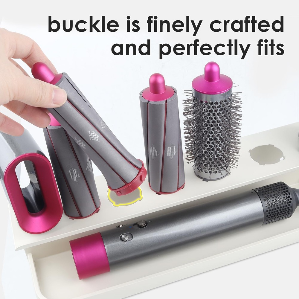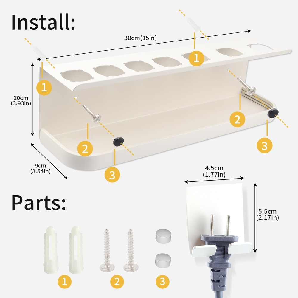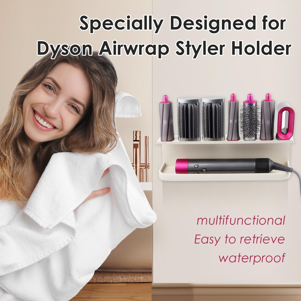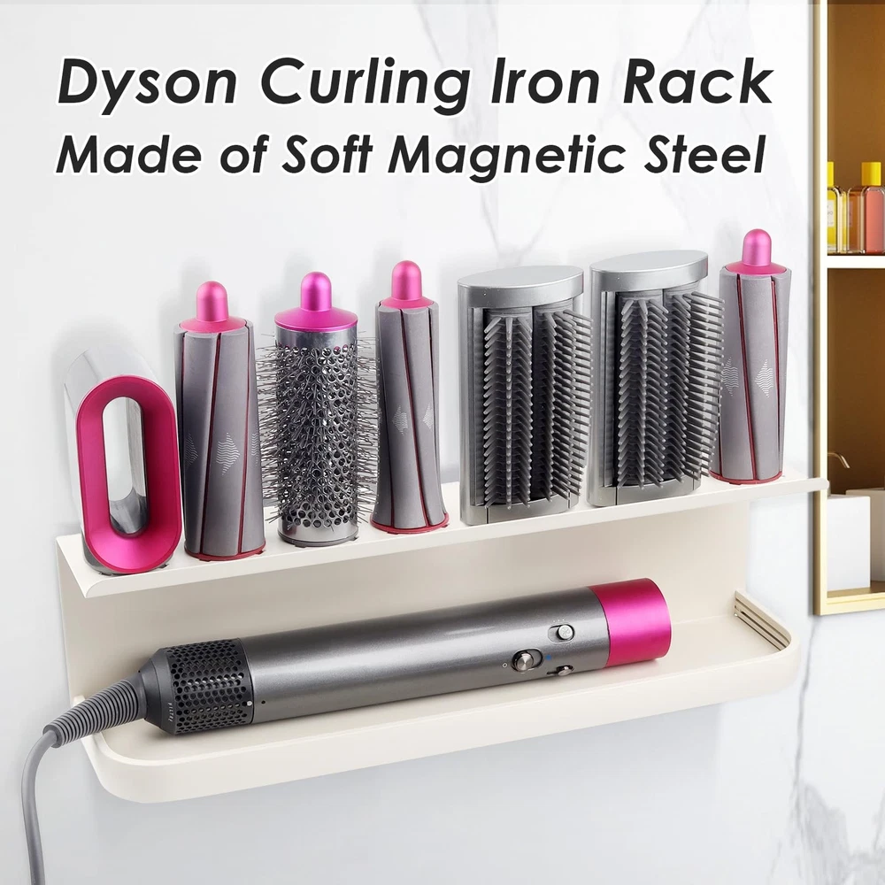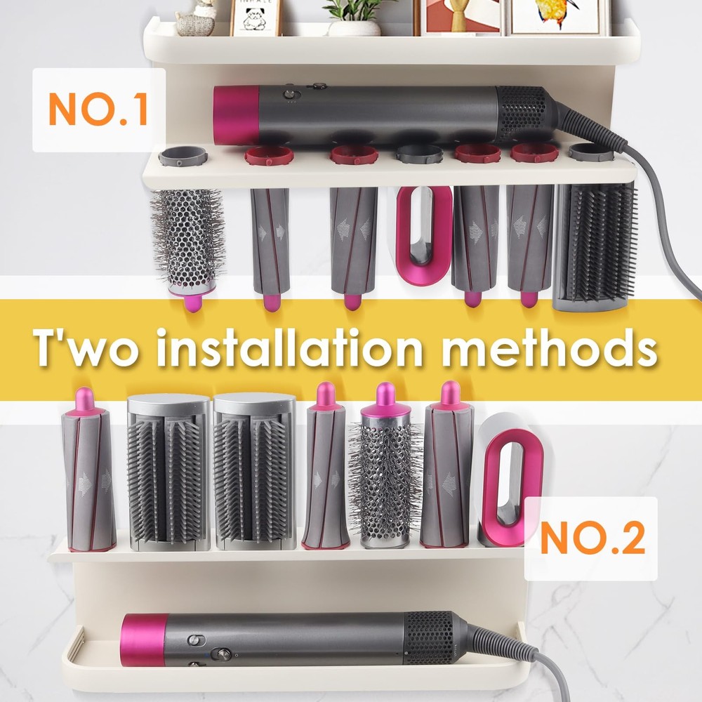 Wall Mounted Storage Holder Compatible with Dyson Airwrap 【Upgrade Space】:multifunctional wall-mounted metal straightener holder (LxWxH: 14.96Inx3.86Inx3.62In). Well-designed, multi-functional storage storage holder compatible with dyson airwrap. 1,There are two installation methods for the storage rack, you can freely choose to install. 2, With 7 storage holes, it can store curling irons, with a widened display table, which can store daily necessities. 3. Made of high-quality steel, it has the advantages of moisture-proof and high-temperature resistance, and the surface is treated with fine arcs Wall mount storage rack for curling iron attachments and complete styler. With the curling irons and hair dryers that you need to use every day, they are often scattered in the corners. Use this multi-functional storage rack to neatly store your daily necessities Storage holder traditional wall-mounted design, with screws, easy to install compatible with most storage needs, flexible and convenient, very suitable for homes, apartments, RVs, barber shops and other places, making your balcony, Bathroom, clean and tidy.