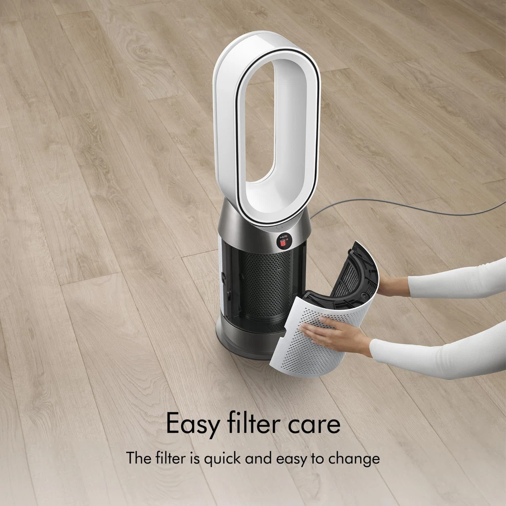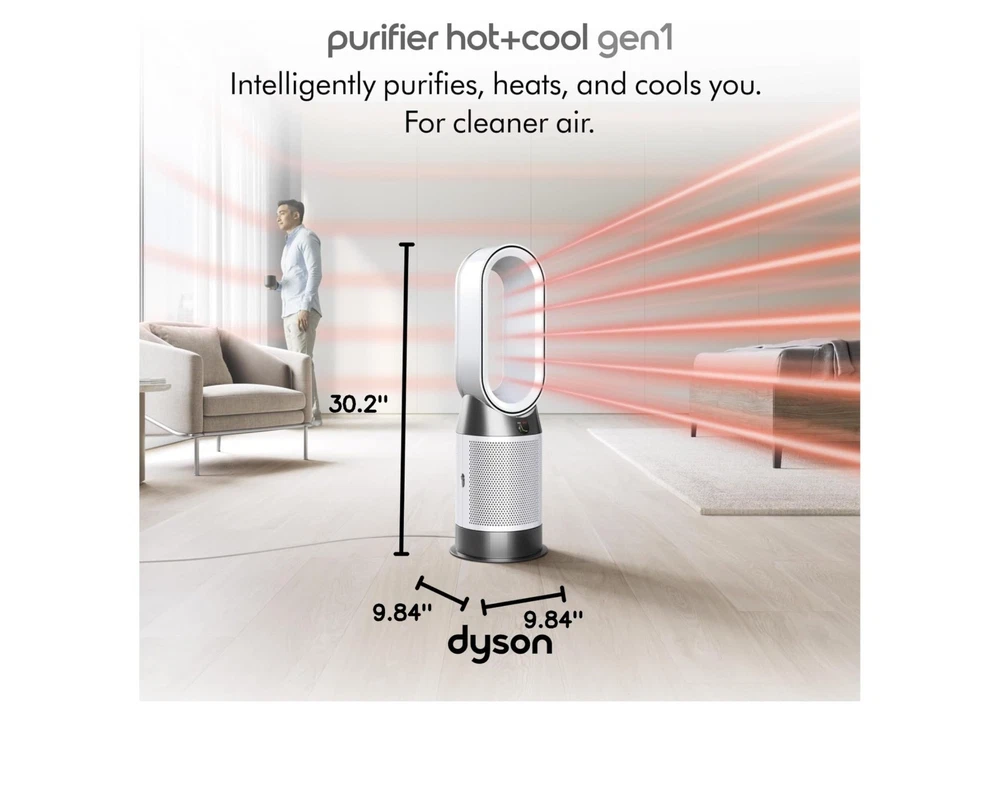 Dyson Purifier Hot+Cool™ Gen1 HP10 - HEPA Air Purifier, Fan & Heater, 350° oscillation, 10 levels, bladeless (White) Air Multiplier technology circulates purified air throughout the whole room.¹ All year-round purifier. Heats in the winter, cools you in the summer. Curved and magnetized remote control stores neatly on the machine. Not app compatible. Oscillates up to 350° Programmed to turn off after pre-set intervals of 1, 2, 4 and 8 hours Fully sealed to HEPA Standard. So what goes inside, stays inside.² Night mode monitors and purifies using the quietest settings, with a dimmed display.