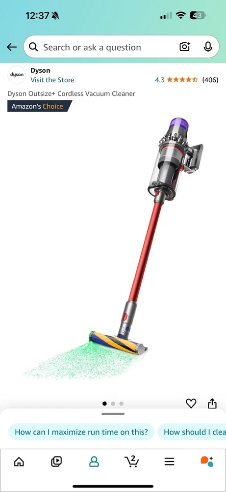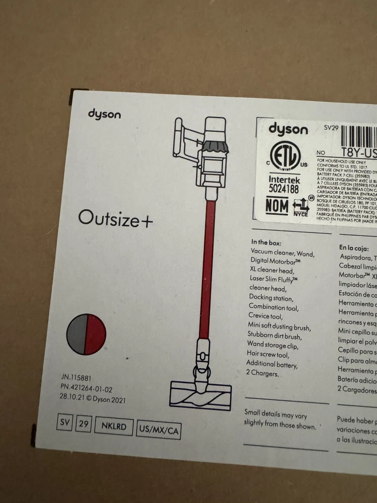 The Dyson Outsize+ Stick Vacuum Cleaner is a cordless vacuum cleaner designed for home use. It has a runtime of 120 minutes and includes a charger. The vacuum cleaner is designed for pet hair removal, multi-surface cleaning, and carpet cleaning. It features washable filters and is battery operated. The voltage is 25.2 V and it comes in a multicolor design. Brand new Factory sealed Free shipping !