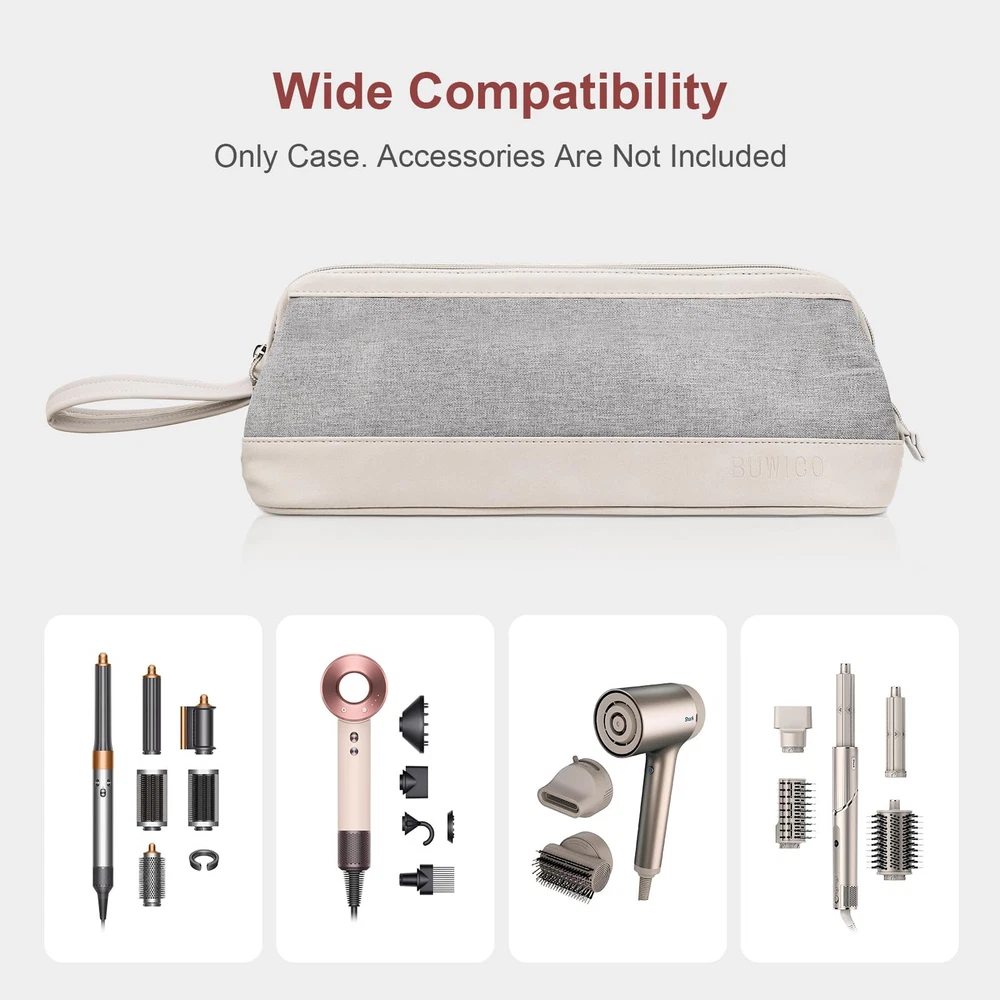Multi-function bag, wide range of application.It is suitable for dyson airwrap styler/ dyson hair dryer HD01/dyson hair dryer HD03/dyson hair straightener/shark flexstyle/shark hair dryer/laifen hair dryer,. It can also be used as a cosmetic organizer case Made of high quality cloth and PU leather material , it is anti-scratch ,dustproof ,waterproof .The inner layer is soft and anti-scratch Spacious storage space, no compartments, the zipper can be opened to both sides to the maximum, easy to take items out and put items in The zipper is durable and smooth .With a carrying strap ,you can carry this case relaxly .bag holds your hairdressing tools and accessories, it is especially suitable for travel and business trips. It is also suitable for home storage, so that they will not clutter on the desktop Product size : 15.3*4.9*6.7 in. Weight : 290 g. Compact size allow you can put it in your luggage. Its whole shape is a triangle, when you take it out, it can be laid flat on the desktop