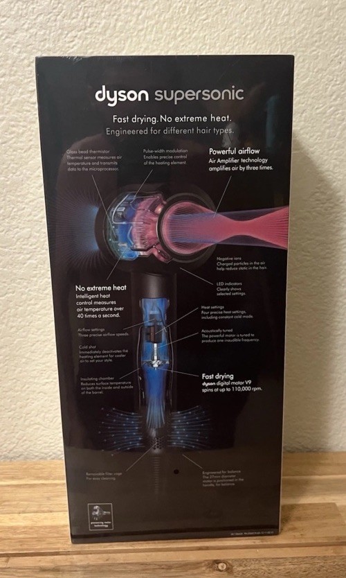 Number of Temperature Settings:3Maximum Temperature:210 °FFeatures:Diffuser, Adjustable Heat SettingsNumber of Speeds:3Color:MulticolorModel:Dyson SupersonicMPN:389920-02Material:PlasticBrand:DysonType:Standard Hair DryerDepartment:WomenPower Source:Electric