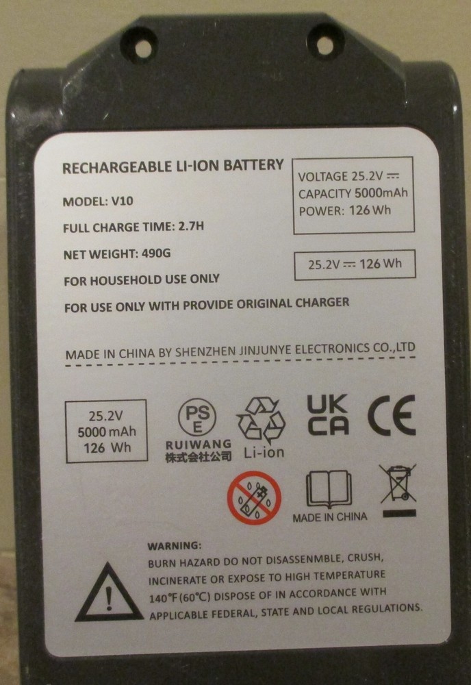 Li-ion Replacement Battery 25.2V 5000mAh 126Wh For Dyson V10. This is an "open box" item, but no box or paperwork included. The blue lights come on when the button is pushed. I have no other way to test it.