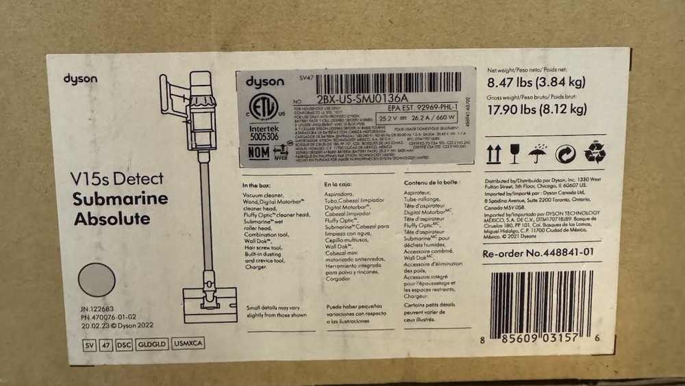 Brand New Sealed. Will be shipped safely and double boxed. Info from Manufacturer about this MPN set: The Dyson V15s Detect Submarine is engineered with the power, intelligence, versatility, and run time to deep clean your whole home. Now with three cleaner heads for all-in-one cleaning. The Submarine™ cleaner head washes hard floors and removes wet and dry debris simultaneously. The Fluffy Optic™ cleaner head reveals invisible dust on hard floors. The de-tangling Digital Motorbar™ cleaner head deep cleans carpets and hard floors without tangles and adapts suction power to floor type.¹ A piezo sensor intelligently optimizes power and run time based on the debris picked up, reporting it all on the LCD screen.¹ The versatile cordless format transforms into a handheld vacuum with one click so you can clean up high, down low, and everywhere in between. Comes with a 2-year warranty and lifetime Dyson support. ¹Accuracy may vary. Best accuracy in Auto mode. Auto ramp feature in Auto mode only. In the box: Submarine™ Wet Roller Head, Digital Motorbar™ cleaner head (colors may vary), Fluffy Optic™ cleaner head, Combination tool, Built-in dusting and crevice tool, Hair screw tool, Drip tray, Charger, Docking station. Removes spills and tough stains | Reveals invisible dust | Captures hair without tangling Pet mess. Meal time clean-ups. Bathroom stains. Three power modes. Click-in battery. LCD screen. No-touch bin emptying. Washable parts. Easy clean wet roller head. Drip tray.