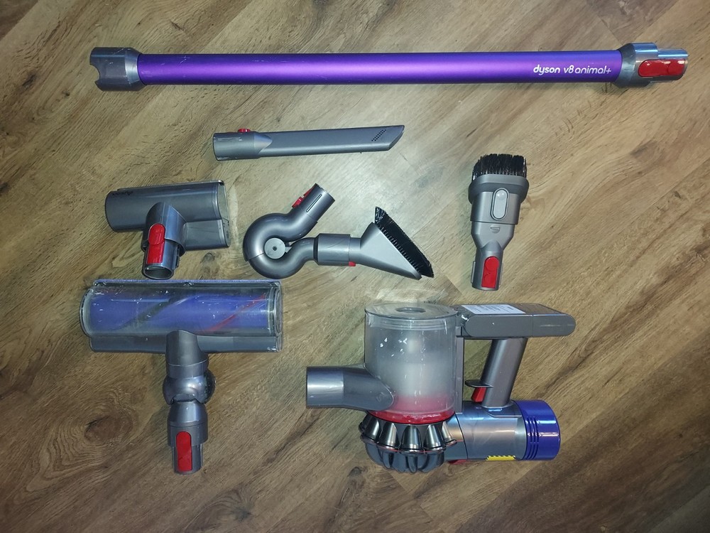 Dyson V8 Animal + Up to 40 minutes run time when using a non-motorized tool. Lightweight and versatile, for easy home cleaning. Instant-release trigger means battery power is only used while it’s cleaning. Requires charging for 4 hours minimum before first use. Direct drive cleaner head. Up to 8 minutes of fade-free power (in MAX mode). Drives stiff nylon bristles into carpets to capture deep-down dirt. Designed to deep clean homes with pets. Whole-machine HEPA filtration captures allergens and expels cleaner air than the air you breathe. In the Box: Dyson V8 Animal Cord-Free Vacuum, Combo Tool, Crevice Tool, Mini Motorhead, Soft Dusting Brush, Up Top Adapter **** Batter was replaced on 01/2025.
