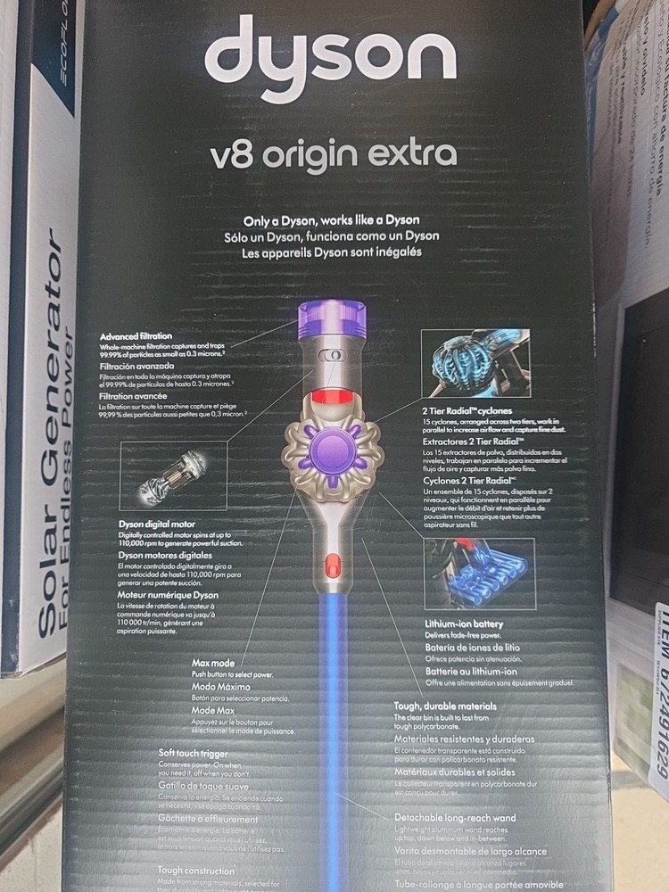 The Dyson V8 Origin Extra Cordless Vacuum is a powerful and lightweight vacuum cleaner that comes with a crevice tool, docking station, motorbar cleaner head, and combination tool. It has a blue color and measures 8.26 inches in height, 9.84 inches in width, and 48.97 inches in length. The vacuum has a powerful suction of 28AW (Min) 115AW (Max) AW and is bagless. It also has washable filters and comes with a 60Hz 120 volts voltage. The vacuum is cordless and has a sleek design, making it perfect for quick cleaning without the hassle of cords.