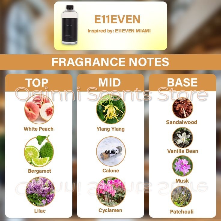 E11even – White Peach, Florals & Warm Vanilla Musk | Premium Diffuser Oil Luxury Scent Description: Step into the vibrant allure of E11even , inspired by the upscale energy of the E11even Bar Miami. The fragrance opens with the juicy sweetness of white peach , the sparkling brightness of bergamot , and the soft elegance of lilac . The heart blooms with exotic ylang ylang , fresh calone , and delicate cyclamen , adding both depth and a hint of aquatic freshness. Finally, the base wraps the senses in musk , creamy sandalwood , vanilla bean , and earthy patchouli , leaving a rich, lingering finish. E11even is a luxurious fusion of fruit, florals, and warm woods—perfect for creating an atmosphere that’s both sophisticated and unforgettable. Fragrance Theme: Fruity Floral Woody Here's why: Lush, fruity top notes ( White Peach , Bergamot , Lilac ) provide brightness and elegance. Floral and fresh aquatic heart ( Ylang Ylang , Calone , Cyclamen ) adds exotic charm and freshness. Warm, sensual base ( Musk , Sandalwood , Vanilla Bean , Patchouli ) offers richness and depth. This blend combines juicy fruits, refined florals, and warm woods for a scent that’s both glamorous and inviting. It could also be classified as: Fruity Floral: Highlighting the peach and lilac in the opening. Woody Oriental: Emphasizing the sandalwood, patchouli, and vanilla. Luxury Lounge-Inspired: Perfect for adding upscale ambiance to your space. Why You’ll Love It: ✔ Premium diffuser oil crafted for long-lasting scent diffusion ✔ Inspired by the luxury nightlife atmosphere of E11even Bar Miami ✔ Works exclusively with waterless cold-air diffusers ✔ Packaged securely to prevent leaks and preserve freshness ✔ A vibrant, refined blend of fruit, florals, and warm woods ✔ Safe for use around pets and children How to Use for Best Results: Use only with a waterless cold-air diffuser for optimal performance. Do not add water to the diffuser oil, as this can affect the fragrance quality and diffuser function. Adjust your diffuser settings to your preferred scent intensity, and store the oil in a cool, dry place away from direct sunlight to preserve its fragrance profile. Disclaimer: E11even are trademarks of Aroma360 LLC and Hotel Collections. Oginni Scents Store and its products are not affiliated with, endorsed by, or in any way associated with Aroma360™ and Hotel Collections or their trademarks. E11EVEN™ is a trademark of GR OPCO LLC. Oginni Scents Store and its products are not affiliated with, endorsed by, or in any way associated with GR OPCO LLC or its trademarks.