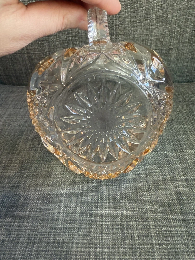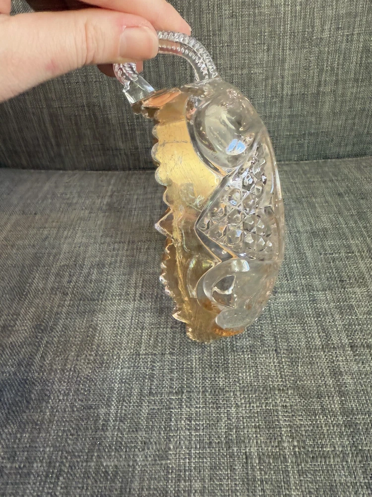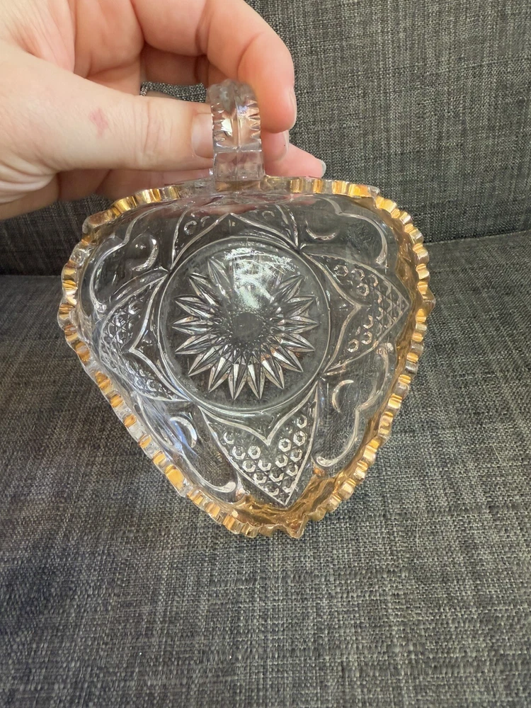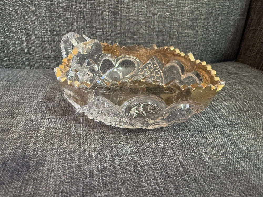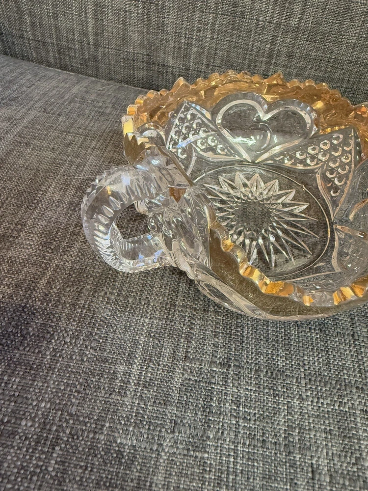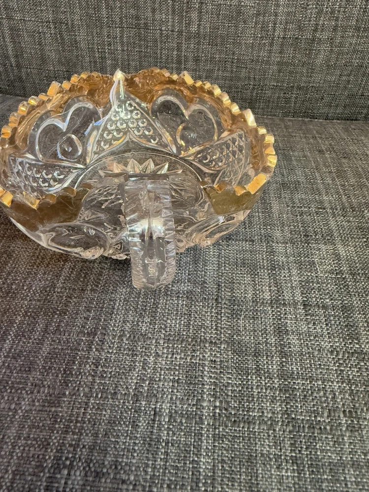 This EAPG nappy glass dish is a vintage decorative piece with gold trim, measuring 6 inches in diameter and 2 inches in height. It is a versatile dish that can be used as a trinket or condiment dish, perfect for adding a touch of elegance to any table setting or display. Made of clear glass in the Depression Glass style, this bowl would make a charming addition to a collection of antique glassware or serve as a unique and functional decor piece in any home.