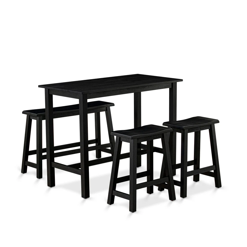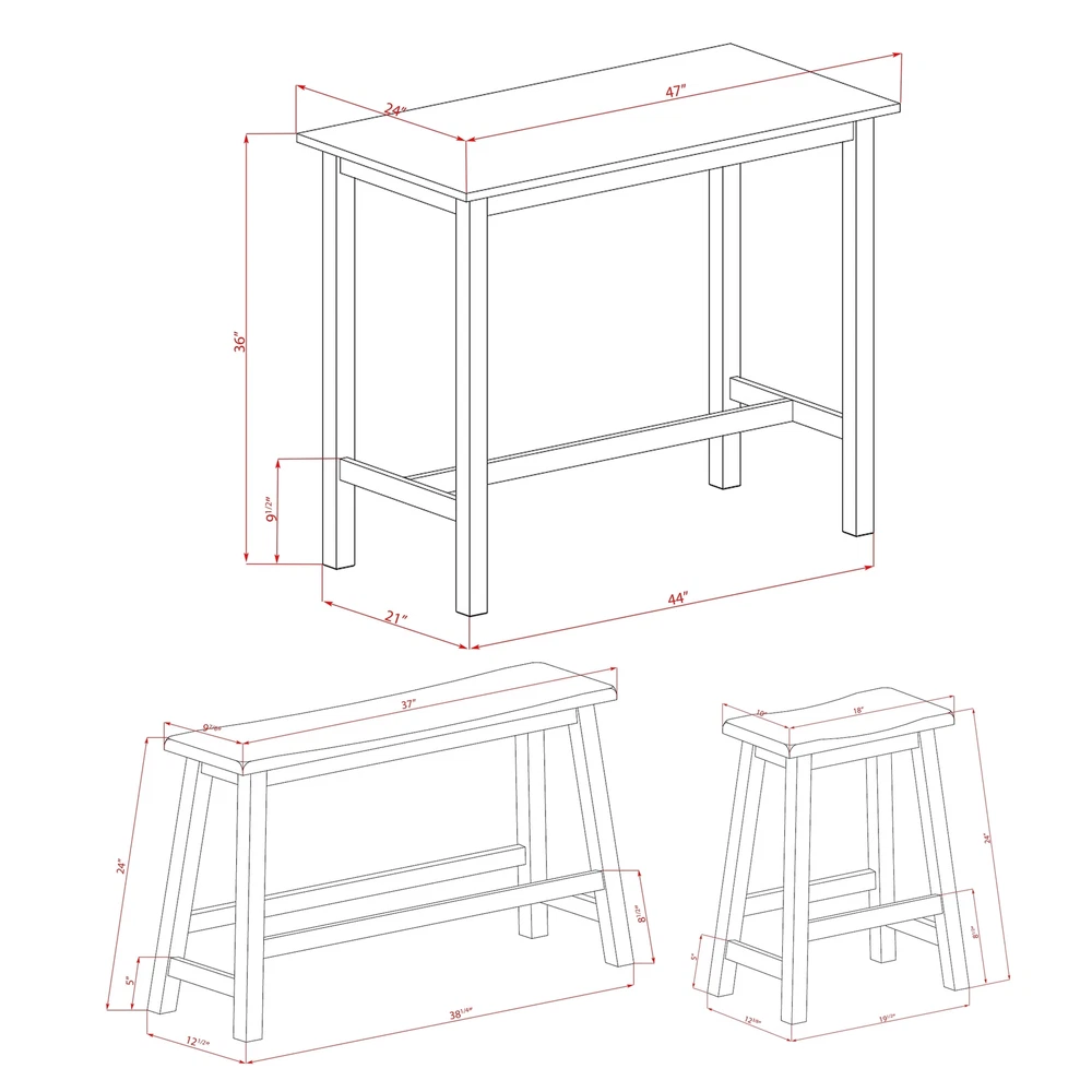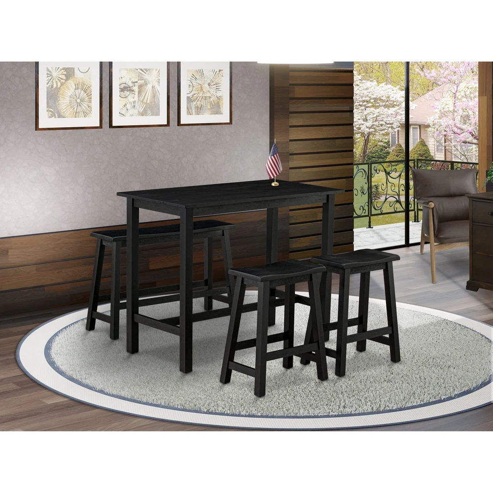 EAST WEST FURNITURE 4-PIECE COUNTER HEIGHT TABLE SETOur dinning set gives a modern kitchen table, 2 stools and 1 wooden bench. This dining table set is created from solid wood that provides more durability and stability to use for a long time. The wooden seats of the dining room bench and counter height bar stools give a comfortable seating experience. Besides, the dining set is equipped with attractive color combinations, which help to improve your dining area. This simple but elegant mid century modern dining set will suit varied decoration styles as well as add more elegance to the room, which is the best combination of practicality and aesthetics. The mid century dining set ergonomic table and wooden stool height allow you to enjoy dinner most comfortably, and the footrest style not Free Shipping Over $49.99* Details EAST WEST FURNITURE 4 Piece Kitchen Dining Table Set- a Dining Table, 2 Stools Product Description: EAST WEST FURNITURE 4-PIECE COUNTER HEIGHT TABLE SET Our dinning set gives a modern kitchen table, 2 stools and 1 wooden bench. This dining table set is created from solid wood that provides more durability and stability to use for a long time. The wooden seats of the dining room bench and counter height bar stools give a comfortable seating experience. Besides, the dining set is equipped with attractive color combinations, which help to improve your dining area. This simple but elegant mid century modern dining set will suit varied decoration styles as well as add more elegance to the room, which is the best combination of practicality and aesthetics. The mid century dining set ergonomic table and wooden stool height allow you to enjoy dinner most comfortably, and the footrest style not only adds stability to the table but also rests your feet. This mid century dining set comes in simple parts that are simple to assemble. Easy-to-follow instruction is contained in the package, and no additional tools are required for assembly. DINING ROOM SET FEATURES: MaterialAsian Wood Table ShapeRectangular Stool Seat MaterialWood Bench ShapeRectangular Table DimensionsLength47; Width24; Height36. Stool DimensionsLength19.4; Width12.4; Height24. Bench DimensionsLength38.4; Width12.4; Height24. Include in this Package4 Piece Dining Room Sets - 1 Table, 1 Dining Bench and 2 Wooden Stools. FINISH OPTIONS AVAILABLE: OPTIONS SKU KATY4-WBW-W East West Furniture 4 Piece Modern Dining Table Set Includes a Rectangular Wooden Table and 2 Stools with a Bench, 24x47 Inch, Wirebrushed Bright White 4 . OPTIONS SKU KATY4-WBL-W East West Furniture 4 Piece Dining Set Contains a Rectangular Dining Room Table and 2 Stools with a Bench, 24x47 Inch, Wirebrushed Black 4 . OPTIONS SKU KATY4-BCH-W East West Furniture 4 Piece Dining Table Set Includes a Rectangular Dining Room Table and 2 Stools with a Bench, 24x47 Inch, Black & Cherry 4 .