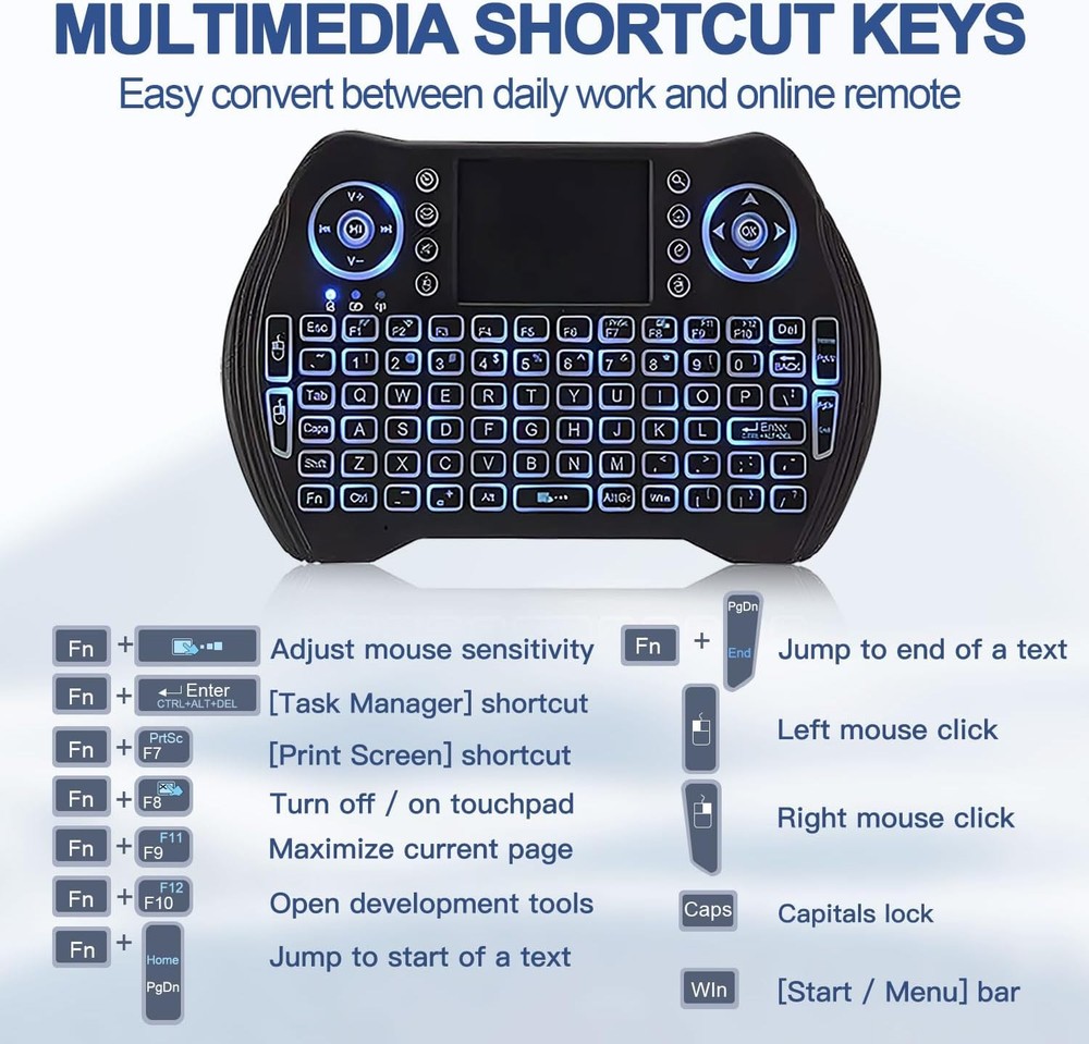 EASYTONE Backlit Mini Wireless Keyboard with Touchpad Mouse Combo Black Product Details Brand: EASYTONE Item model number: E-I8B Operating System: Linux, Android Item Weight: 3.84 ounces Product Dimensions: 5.78 x 0.75 x 3.84 inches Item Dimensions LxWxH: 5.78 x 0.75 x 3.84 inches Color: Black Power Source: Battery Powered Batteries: 1 Lithium Ion batteries required. (included) Manufacturer: EASYTONE Is Discontinued By Manufacturer: No Brand: EASYTONE Color: Black Connectivity Technology: Usb Special Feature: Rechargeable Compatible Devices: Laptop, Gaming Console, Television, Personal Computer 【Easy to Connect & Use】The mini wireles keyboard remote is connected via USB receiver(included) and the work distance up to 10 meters. Just plug and play. very easy to connect and use. Powerful function (keyboard + touchpad + mouse) very perfect for browsing the web, playing games or watching TV. 【Widely Compatibility】The mini keyboard with touchpad can be used for Android TV box, smart TV, PC, Pad, Raspberry PI, PS3, x-box, desktop, laptop, smart phone,HTPC/IPTV, etc. If there is not a USB port, you need to prepare a OTG cable. 【Mutil-Colors Backlit and Rechargeable Battery】The USB mini keyboard has mutil-colors of backlit mode which can clear operate the keys when work at night, don't need to turn on the light which disturbing your families. With auto sleep and wake-up function, and comes with a rechargeable Li-ion battery, it can work for a long time. 【Portable Keyboard】 This small keyboard is designed Small and handheld design, has a innovative shape and petite size, takes up very minimal space in you bag and just makes you say goodbye to chunky keyboard to horizon a new experience of office entertainment anywhere, anytime. 【Sensitive Touchpad & Hotkeys】Wireless mini keyboard with multi-finger touchpad and combo with 8 hotkeys can easy and accurate manipulation. Easy to type and copy / paste, making it faster and more convenient for you browse the page.