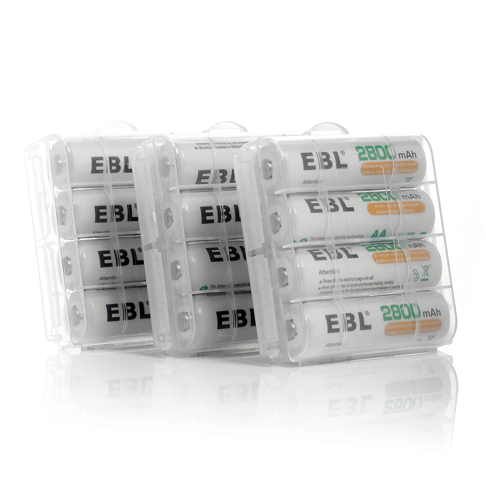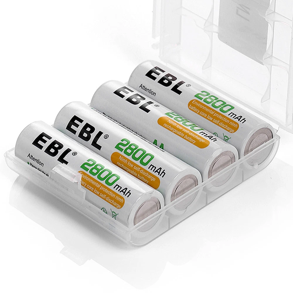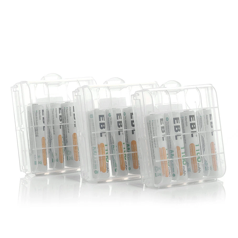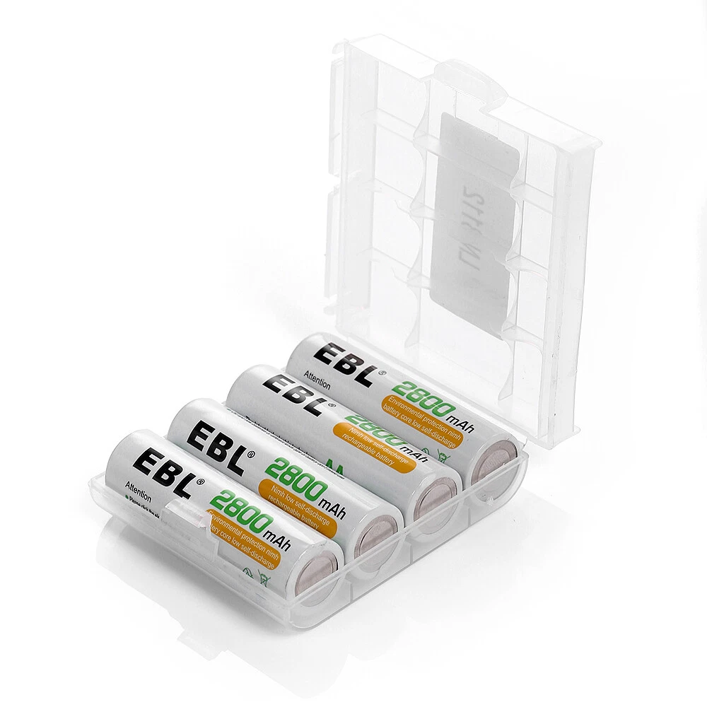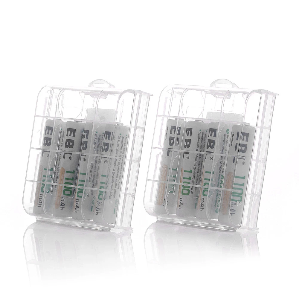 Features For AA & AAA Ni-MH Rechargeable Batteries: Features 1. EBL Branded ,Pro-environment. 2. NO memory effect NIMH chemistry. 3. Recharged up to 1000 times. 4. Relatively long service life. 5. 100% New and high quality. 6. Superior performance under low temperature condition. The Details 1. Battery Voltage: 1.2V 2. Capacity: (800mAh AAA)/(1100mAh AAA )/(2300mAh AA )/(2800mAh AA) 3. Battery Size: AAA/AA 4. Rechargeable type: Ni-MH/ NIMH High capacity NO memory 5. Storage Case : Yes (for 4PCS Battery/per case) 6. Brand: EBL 7. Model: R03/ R06 8. Case : included(4pcs battery /case) For 500mAh AAA 1000mah AA Ni-CD Rechargeable Batteries: 1. Battery Type: AAA/ AA 2. Capacity: 400mAh/1000mAh 3. Voltage: 1.2V 4. Chemistry: Ni-CD 5. Weight: 7.8 ounce (220 g) 6. Pro-environment, 7. EBL batteries can be recharged up to 1200 times when fully or partially drained. 8. Batteries are great for use in household devices such as digital cameras, toys, remote controls, hand held games Compatible with Flash Light,LED Torch ,Camera, Remote control, Garden solar light, ,Detector ,toys etc , multifunction battery Package 4~20pcs AA / AAA Rechargeable Batteries (see dropdown menu droplist) with Clear Storage Box( 4pcs batteries /Case)