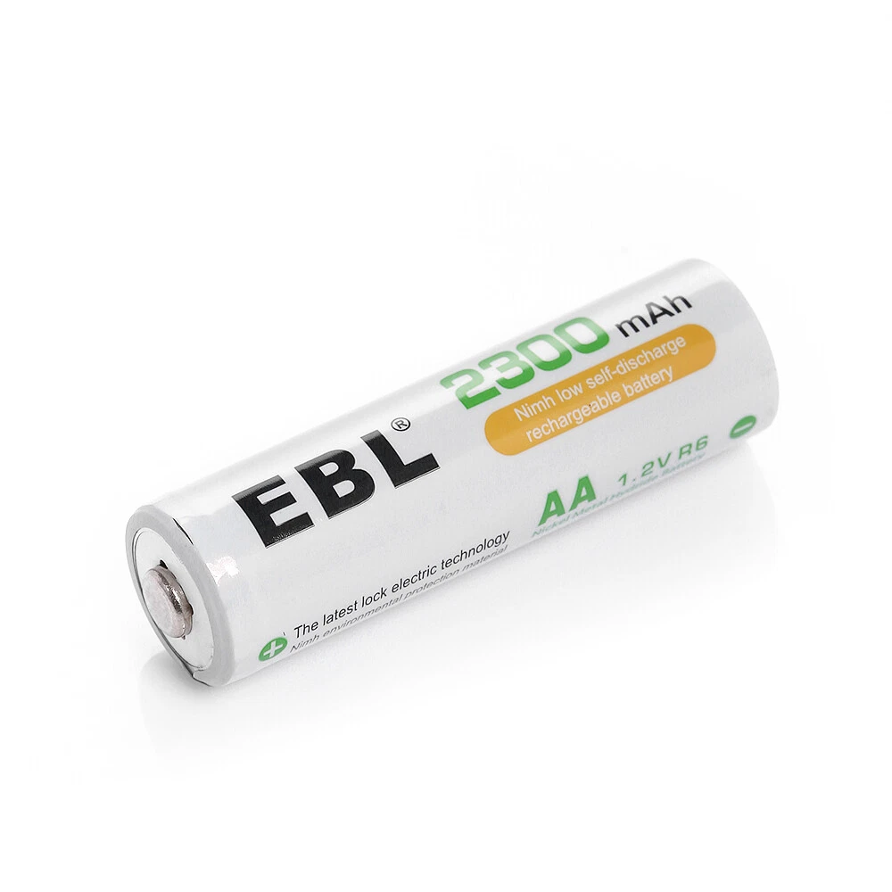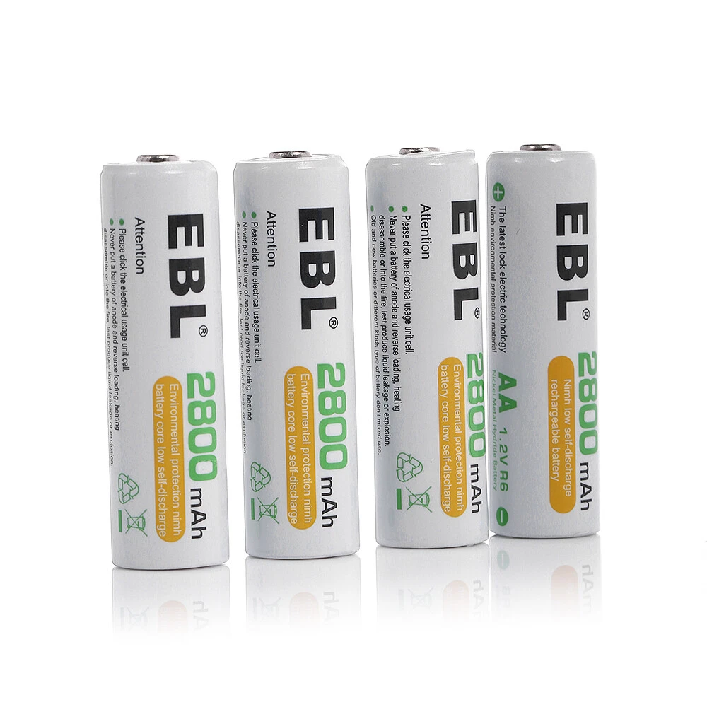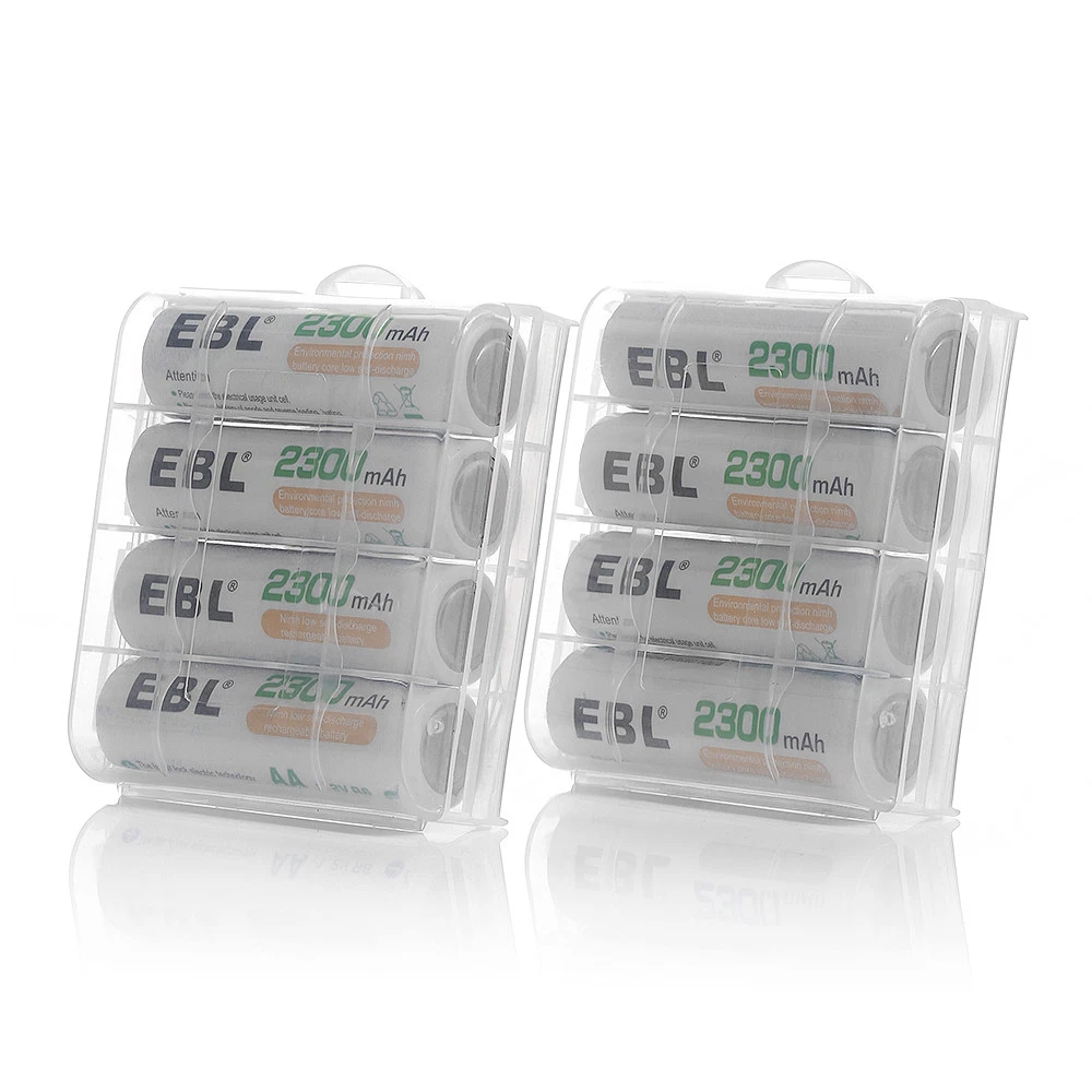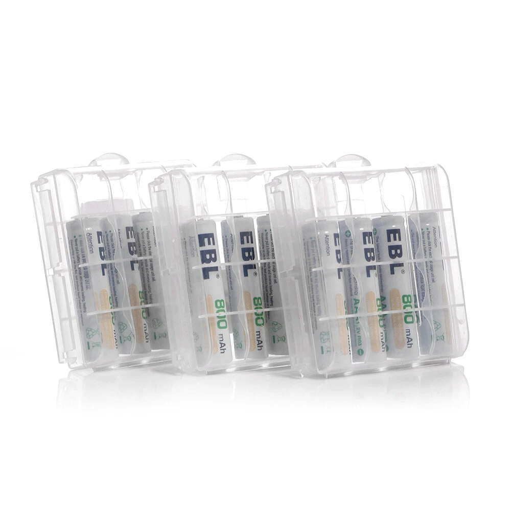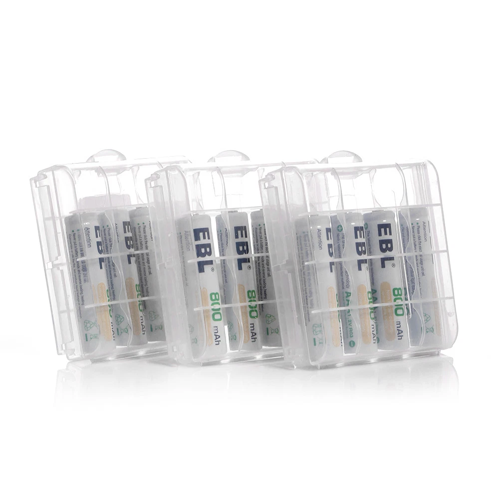 Features For AA & AAA Ni-MH Rechargeable Batteries: Features 1. EBL Branded ,Pro-environment. 2. NO memory effect NIMH chemistry. 3. Recharged up to 1000 times. 4. Relatively long service life. 5. 100% New and high quality. 6. Superior performance under low temperature condition. The Details 1. Battery Voltage: 1.2V 2. Capacity: (800mAh AAA)/(1100mAh AAA )/(2300mAh AA )/(2800mAh AA) 3. Battery Size: AAA/AA 4. Rechargeable type: Ni-MH/ NIMH High capacity NO memory 5. Storage Case : Yes (for 4PCS Battery/per case) 6. Brand: EBL 7. Model: R03/ R06 8. Case : included(4pcs battery /case) For 500mAh AAA 1000mah AA Ni-CD Rechargeable Batteries: 1. Battery Type: AAA/ AA 2. Capacity: 400mAh/1000mAh 3. Voltage: 1.2V 4. Chemistry: Ni-CD 5. Weight: 7.8 ounce (220 g) 6. Pro-environment, 7. EBL batteries can be recharged up to 1200 times when fully or partially drained. 8. Batteries are great for use in household devices such as digital cameras, toys, remote controls, hand held games Compatible with Flash Light,LED Torch ,Camera, Remote control, Garden solar light, ,Detector ,toys etc , multifunction battery Package 4~20pcs AA / AAA Rechargeable Batteries (see dropdown menu droplist) with Clear Storage Box( 4pcs batteries /Case)