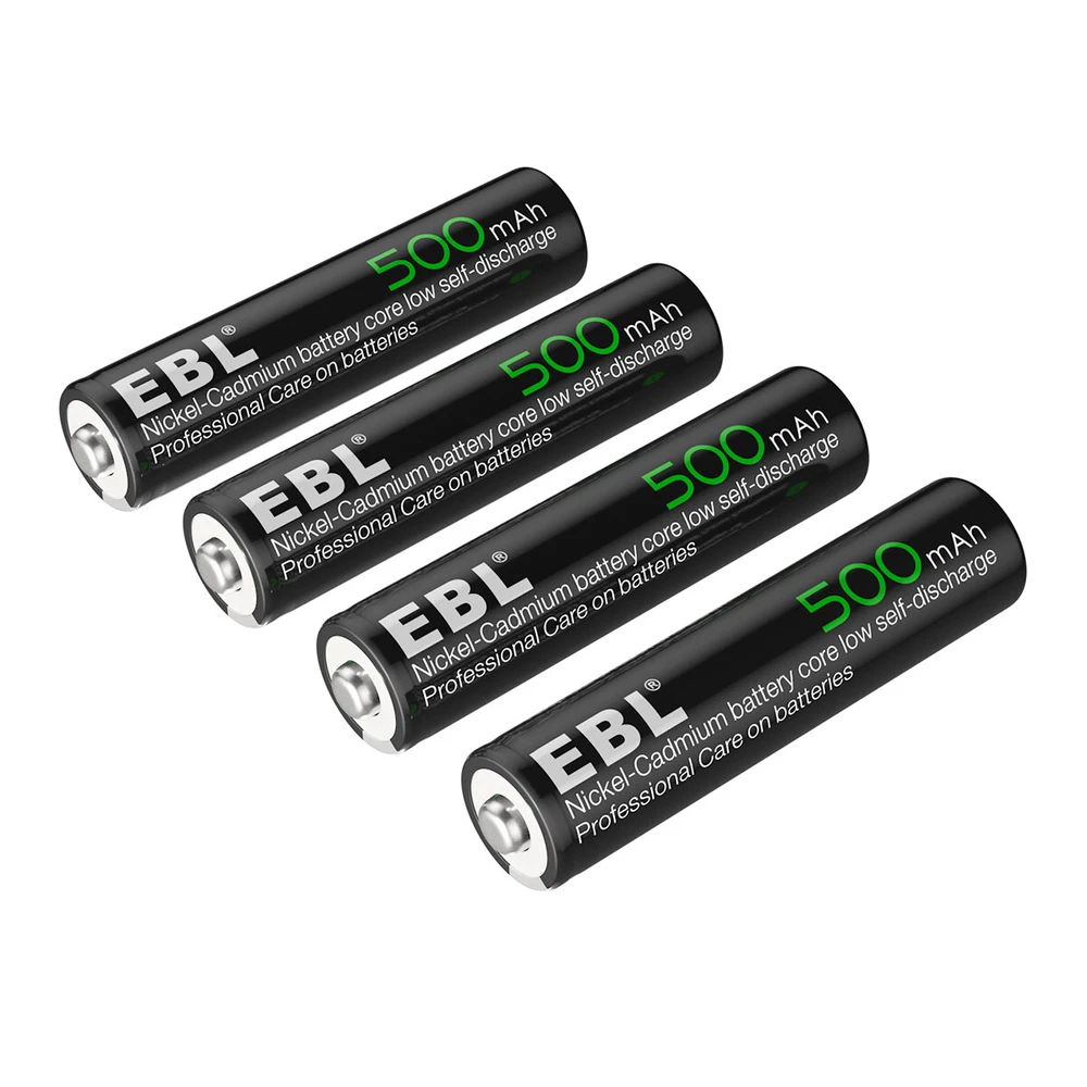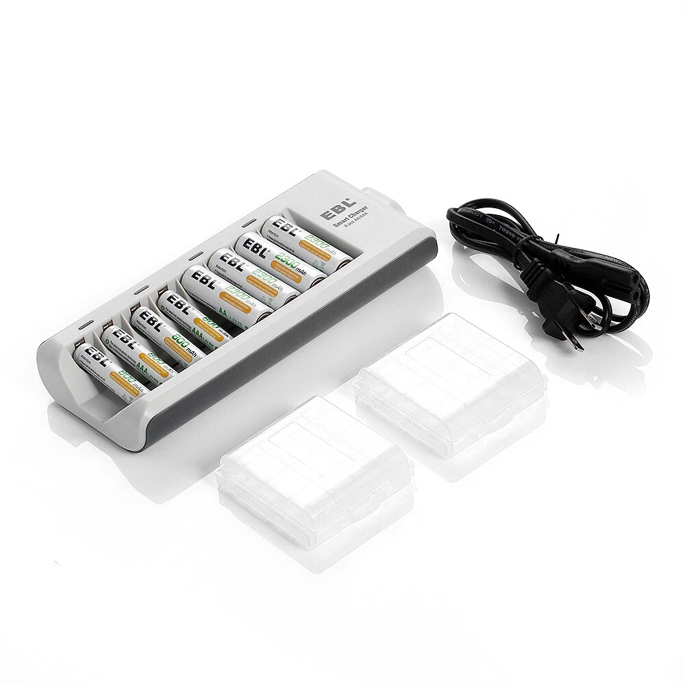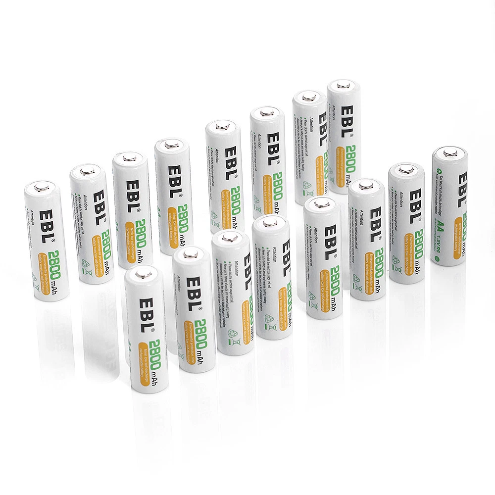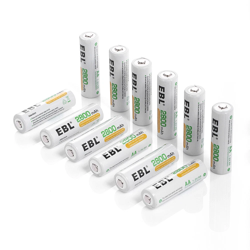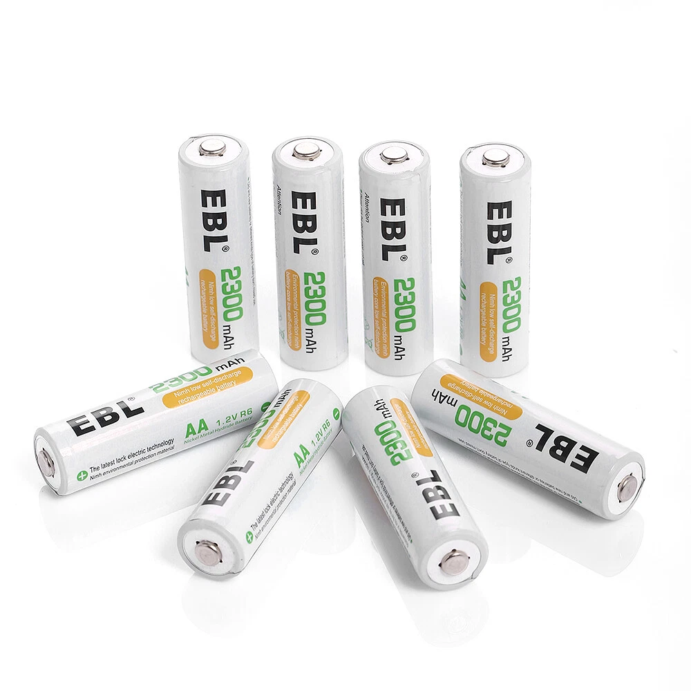Features For AA & AAA Ni-MH Rechargeable Batteries: Features 1. EBL Branded ,Pro-environment. 2. NO memory effect NIMH chemistry. 3. Recharged up to 1000 times. 4. Relatively long service life. 5. 100% New and high quality. 6. Superior performance under low temperature condition. The Details 1. Battery Voltage: 1.2V 2. Capacity: (800mAh AAA)/(1100mAh AAA )/(2300mAh AA )/(2800mAh AA) 3. Battery Size: AAA/AA 4. Rechargeable type: Ni-MH/ NIMH High capacity NO memory 5. Storage Case : Yes (for 4PCS Battery/per case) 6. Brand: EBL 7. Model: R03/ R06 8. Case : included(4pcs battery /case) For 500mAh AAA 1000mah AA Ni-CD Rechargeable Batteries: 1. Battery Type: AAA/ AA 2. Capacity: 400mAh/1000mAh 3. Voltage: 1.2V 4. Chemistry: Ni-CD 5. Weight: 7.8 ounce (220 g) 6. Pro-environment, 7. EBL batteries can be recharged up to 1200 times when fully or partially drained. 8. Batteries are great for use in household devices such as digital cameras, toys, remote controls, hand held games Compatible with Flash Light,LED Torch ,Camera, Remote control, Garden solar light, ,Detector ,toys etc , multifunction battery Package 4~20pcs AA / AAA Rechargeable Batteries (see dropdown menu droplist) with Clear Storage Box( 4pcs batteries /Case)