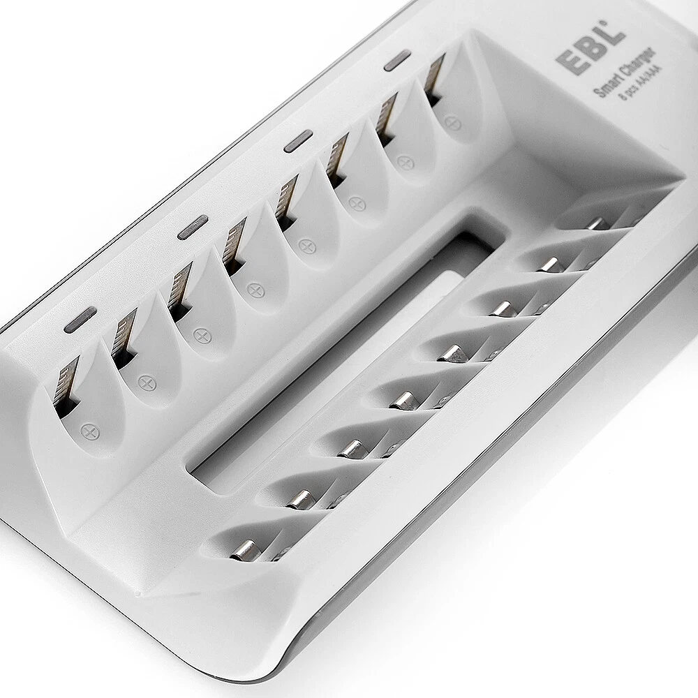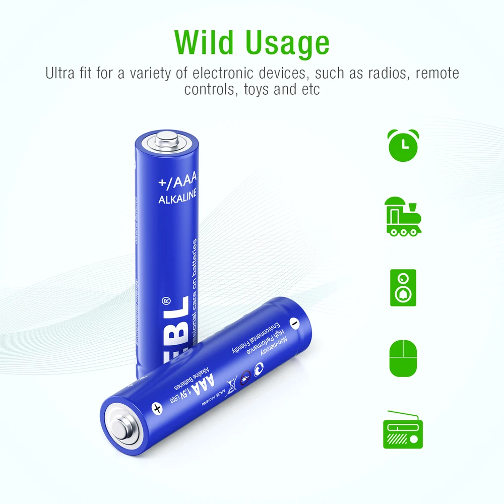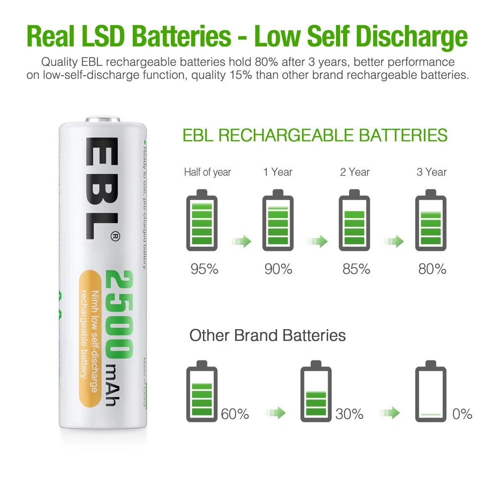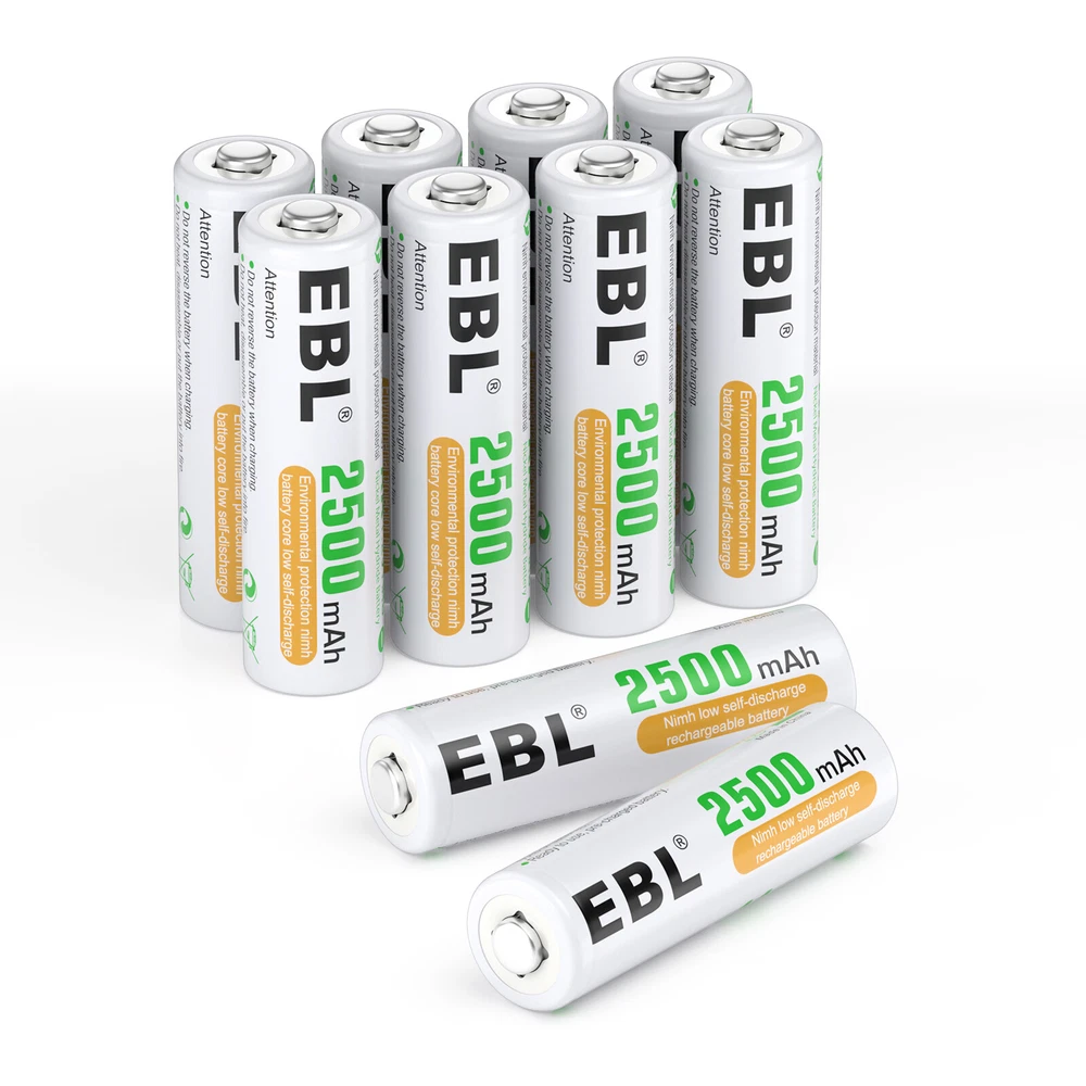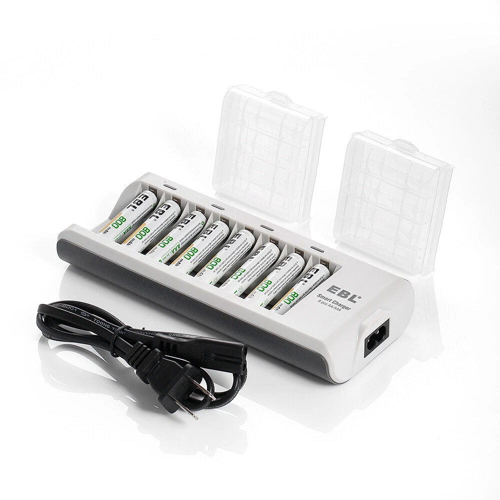 Features For AA & AAA Ni-MH Rechargeable Batteries: Features 1. EBL Branded ,Pro-environment. 2. NO memory effect NIMH chemistry. 3. Recharged up to 1000 times. 4. Relatively long service life. 5. 100% New and high quality. 6. Superior performance under low temperature condition. The Details 1. Battery Voltage: 1.2V 2. Capacity: (800mAh AAA)/(1100mAh AAA )/(2300mAh AA )/(2800mAh AA) 3. Battery Size: AAA/AA 4. Rechargeable type: Ni-MH/ NIMH High capacity NO memory 5. Storage Case : Yes (for 4PCS Battery/per case) 6. Brand: EBL 7. Model: R03/ R06 8. Case : included(4pcs battery /case) For 500mAh AAA 1000mah AA Ni-CD Rechargeable Batteries: 1. Battery Type: AAA/ AA 2. Capacity: 400mAh/1000mAh 3. Voltage: 1.2V 4. Chemistry: Ni-CD 5. Weight: 7.8 ounce (220 g) 6. Pro-environment, 7. EBL batteries can be recharged up to 1200 times when fully or partially drained. 8. Batteries are great for use in household devices such as digital cameras, toys, remote controls, hand held games Compatible with Flash Light,LED Torch ,Camera, Remote control, Garden solar light, ,Detector ,toys etc , multifunction battery Package 4~20pcs AA / AAA Rechargeable Batteries (see dropdown menu droplist) with Clear Storage Box( 4pcs batteries /Case)