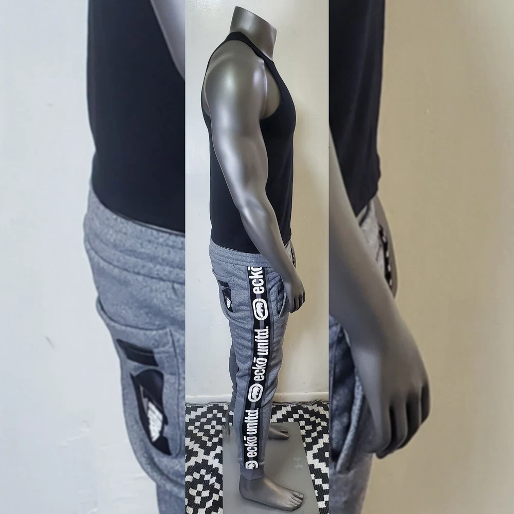 ECKO UNLTD SIDE SEAM PRINTED TAPE FLEECE JOGGER PANTS MEN'S SIZE L GREY MARLED. Condition is "New with tags".The must have jogger of the season The stylish Ecko Unltd Logo tape jogger with stylish taping down the legs.Elevate your look with the faux texture prints and printed tape details on these Ecko Unltd fleece joggers. • Drawstring waist • Imported · Printed tape detailing · Side pockets · Two rear pockets Material & Care · 100% Polyester