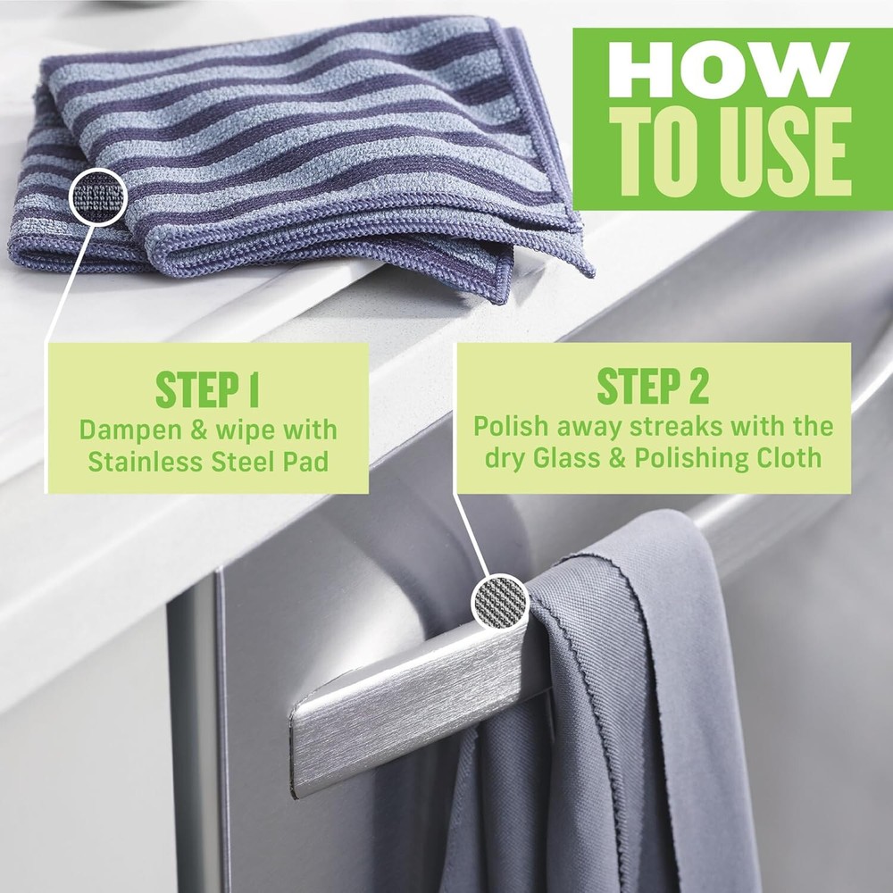 About this item 75% Polyester, 15% Polyamide 10% Polypropylene. STAINLESS STEEL KIT: All you need to keep stainless steel true to its name, our kit comes with a dual-sided cleaning cloth and a polishing cloth that doesn't need pastes, wipes, or sprays. WATER ACTIVATED: With precision-engineered microfibers that lift away virtually all grime, dirt, and dust, our cleaning cloths deliver a complete clean when activated with water, eliminating the need for additional cleaners. DUAL SIDED CLEAN: Dampen the Stainless Steel Cloth, wring, and wipe. The striped textured side is designed for brushed steel and the softer solid side for polished steel. Finish with the polishing cloth to leave the surface shining and streak-free. REUSE AND SAVE: Our reusable cloths go in the laundry, not the landfill. They come with a 100-wash, one-year promise that means they can be used again and again, helping you save in the long run while ridding the world of disposable cleaners. E-CLOTH: We develop ecological cleaning methods that cover all facets of life. Through dedicated education, research, and partnerships, E-Cloth is a revolutionary cleaning system that seeks to leave the world in a better place than it was yesterday.