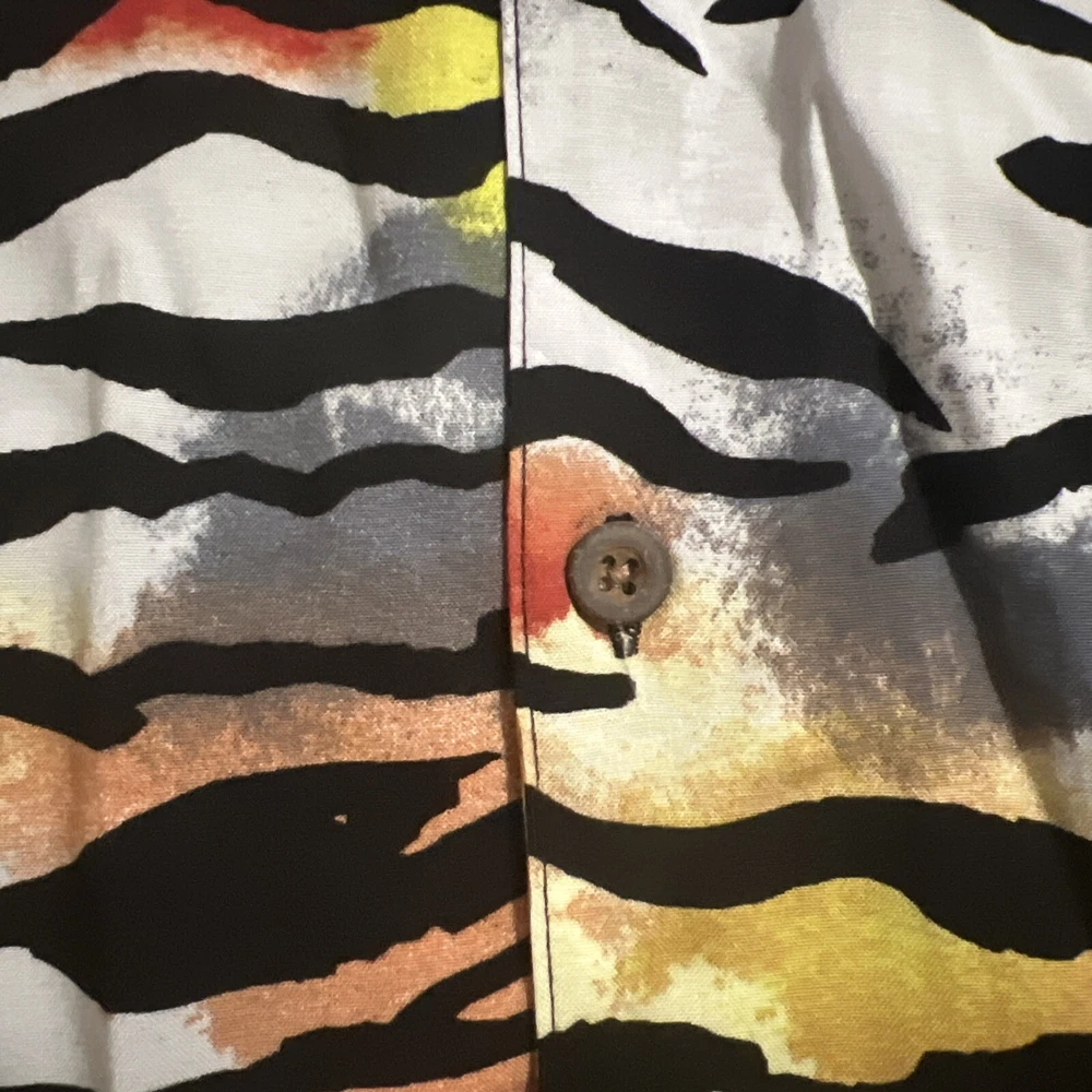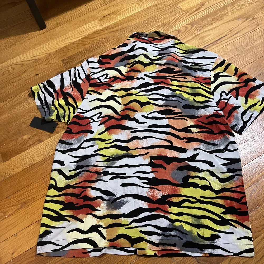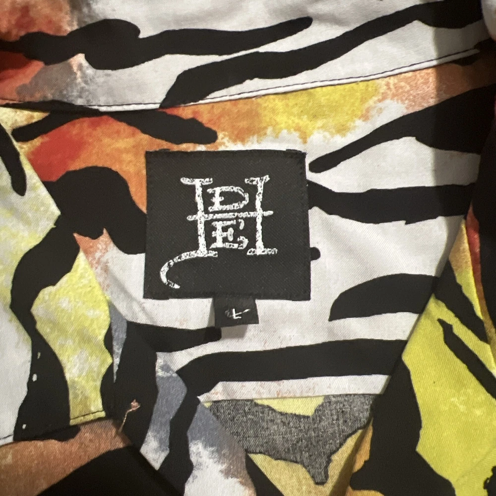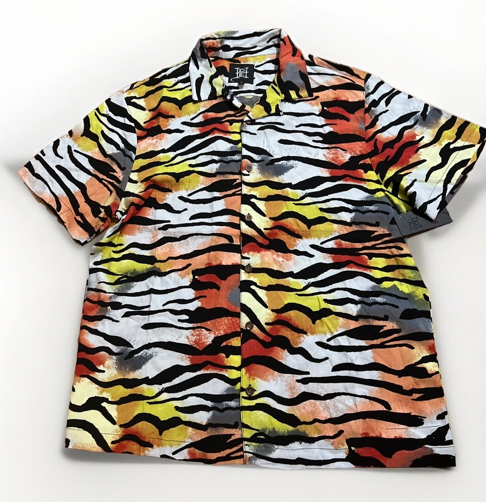 Make a statement with this Ed Hardy button-up shirt featuring a bold tiger print in a vibrant multicolor design. Perfect for a casual day out or a party, this shirt is made from lightweight and comfortable rayon material that is easy to care for and quick-drying. The short-sleeved shirt is designed with a collared neckline and a regular fit, making it suitable for any occasion. Chest measures 23 inches across Men’s size large new with tags Sold as is No returns