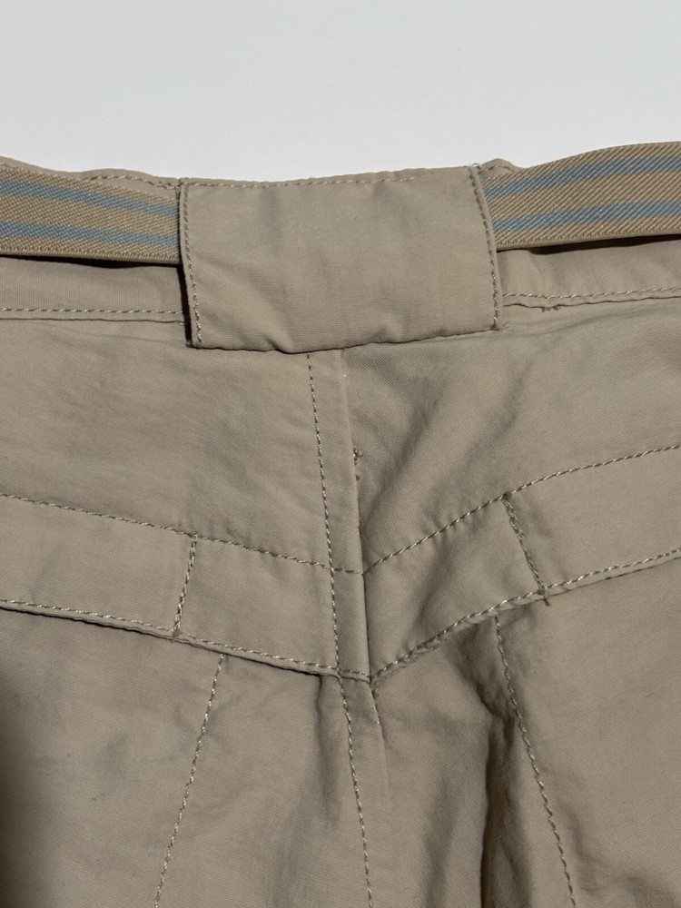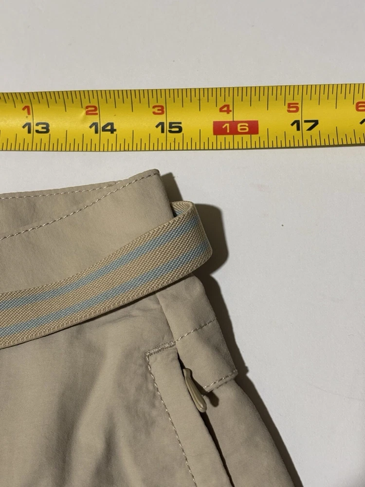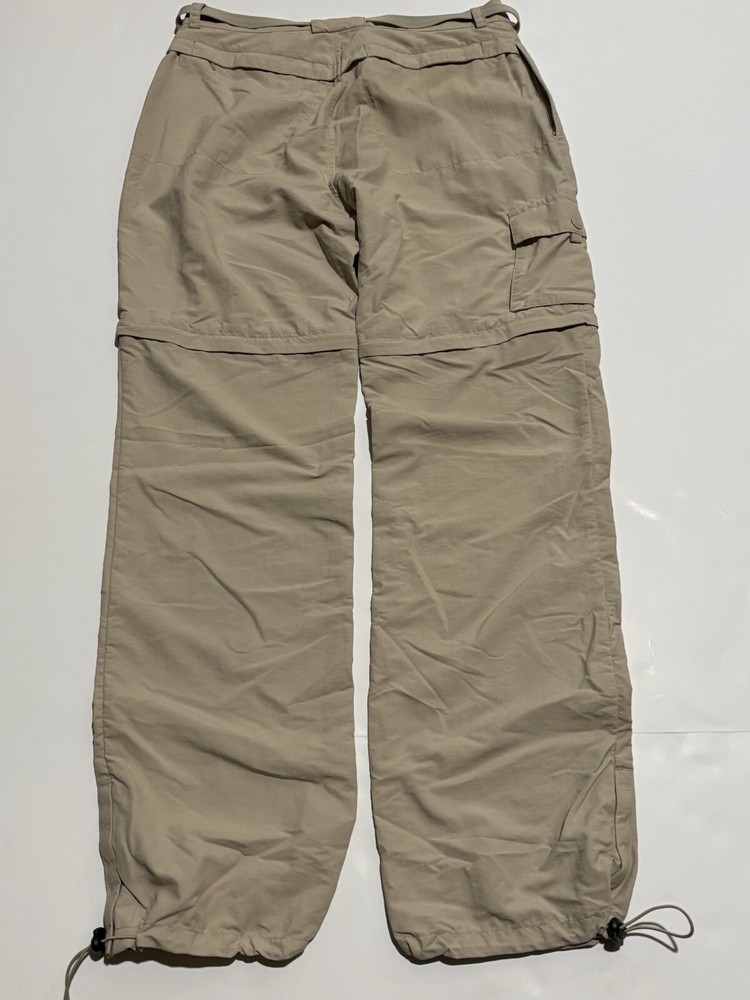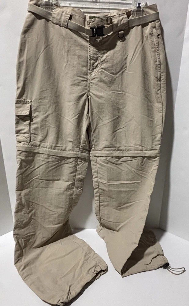 These Eddie Bauer women's size 6 outdoor hiking performance cargo pants are made of lightweight nylon with adjustable features like the waist and ankles. They feature mesh pockets, a colorful belt, and a zipper closure. Ideal for travel, casual wear, or workwear, these beige pants have a straight leg design and a flat front. Perfect for outdoor activities in various seasons.