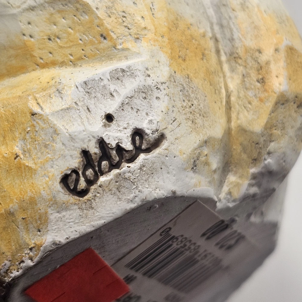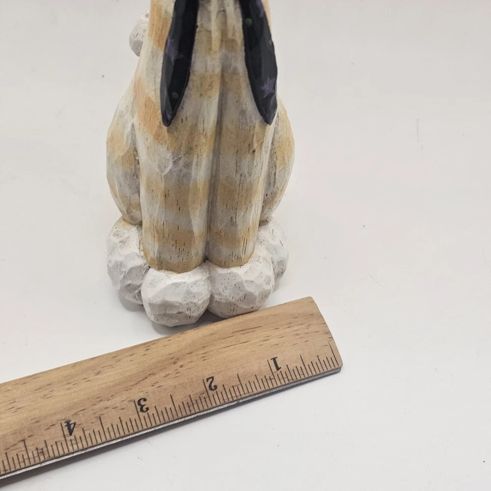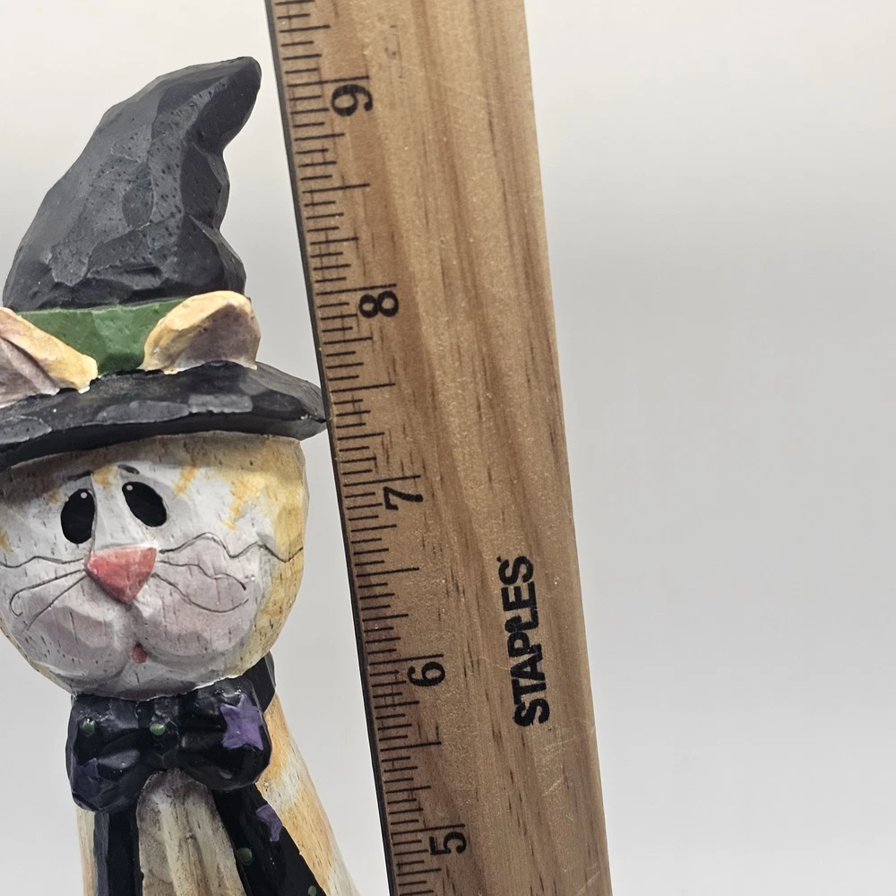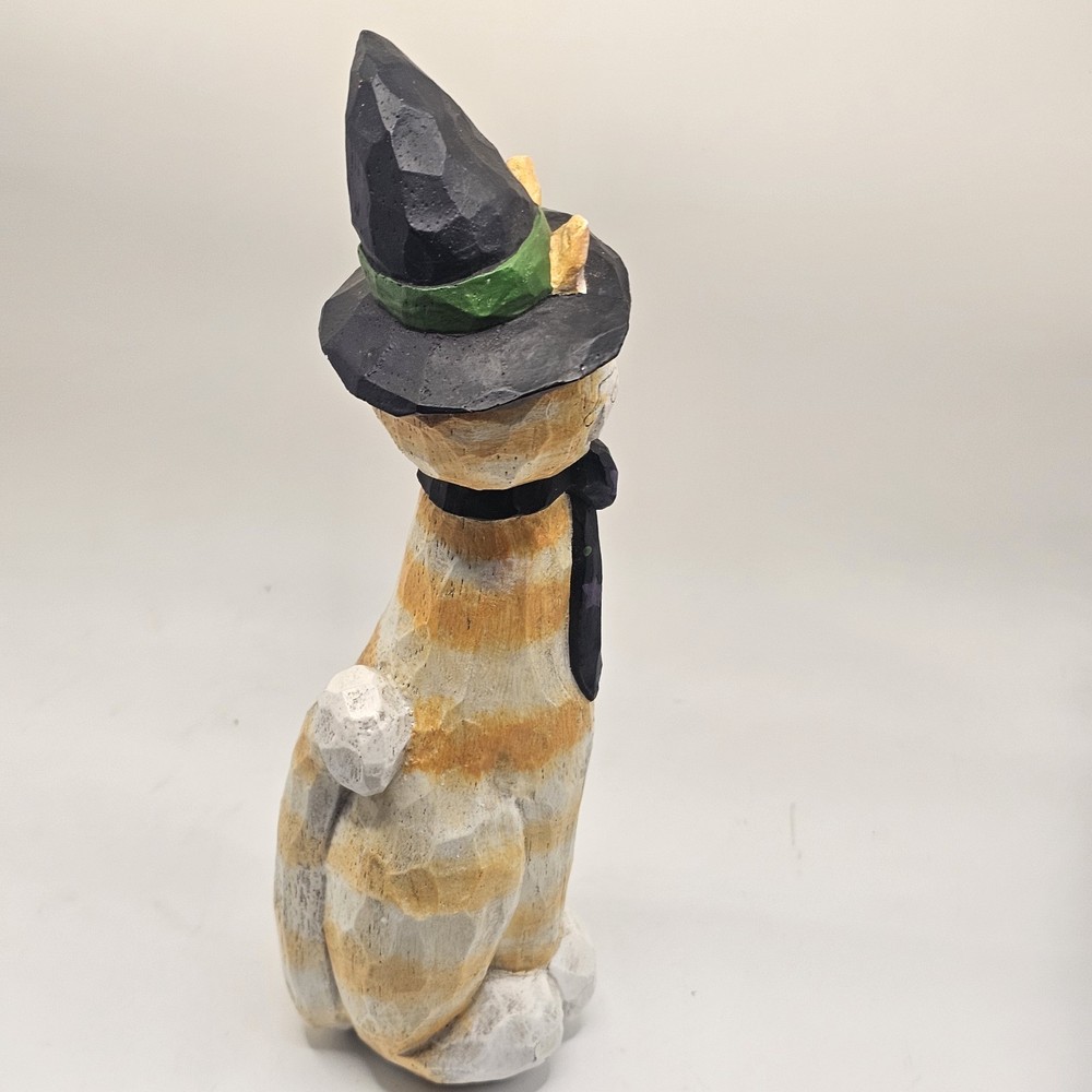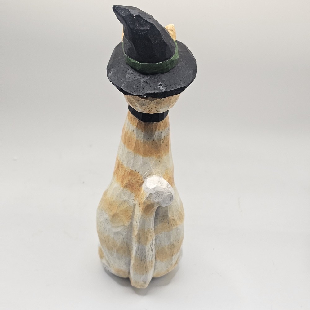 The product is a 9" figurine sculpture of a Halloween Cat Witch with an orange tabby design, signed by artist Eddie Walker. Made by Midwest of Cannon Falls, this multicolored figurine is a unique collectible perfect for celebrating Halloween. The sculpture features intricate details and is a charming addition to any holiday decor collection. See photos for imperfections sold as is