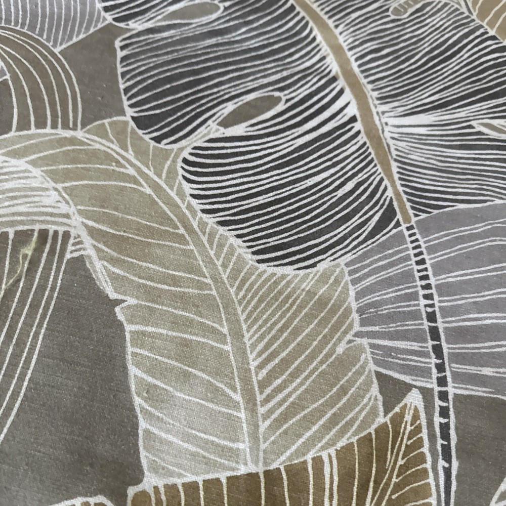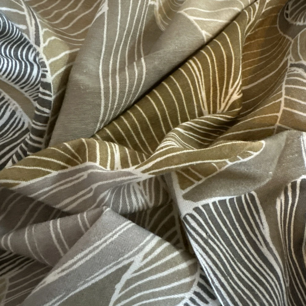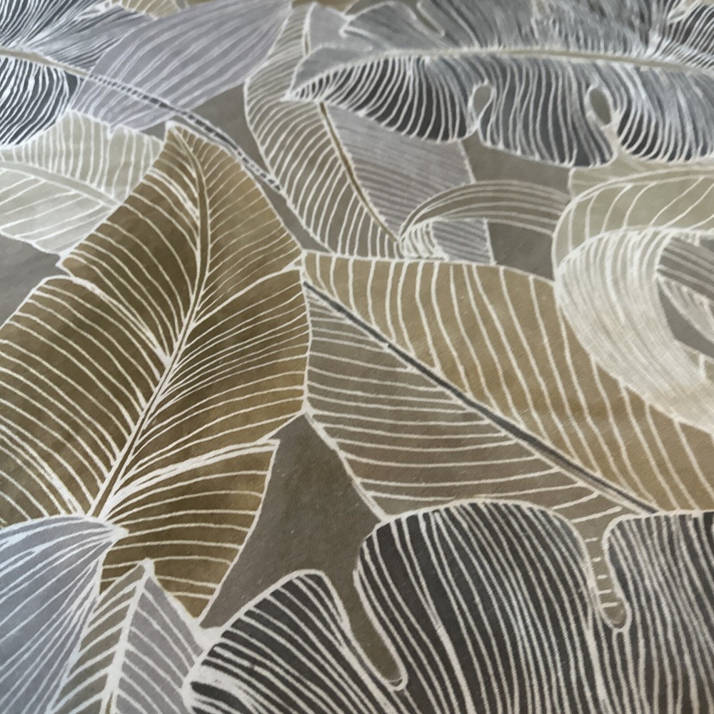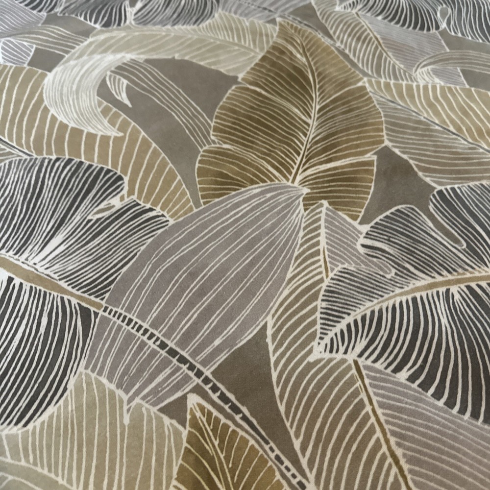 Embrace the warmth of the EDINBURGH WEAVERS Palm Leaf fabric, a stunning choice for those seeking to add a touch of nature-inspired elegance to their home or creative project. This Amber Gold colourway brings a rich, sun-soaked ambiance into any space, perfect for draping, curtains, cushions, or upholstering a statement piece. At a width of 54 inches and a length of 7 metres, this medium-weight fabric is versatile for both small and large-scale applications. Crafted from a premium blend of viscose and linen, the fabric's digitally printed pattern captures the essence of palm leaves, creating an inviting and relaxed atmosphere. Proudly manufactured in the United Kingdom, this roll of fabric is a testament to quality and style, suitable for a variety of projects and settings.