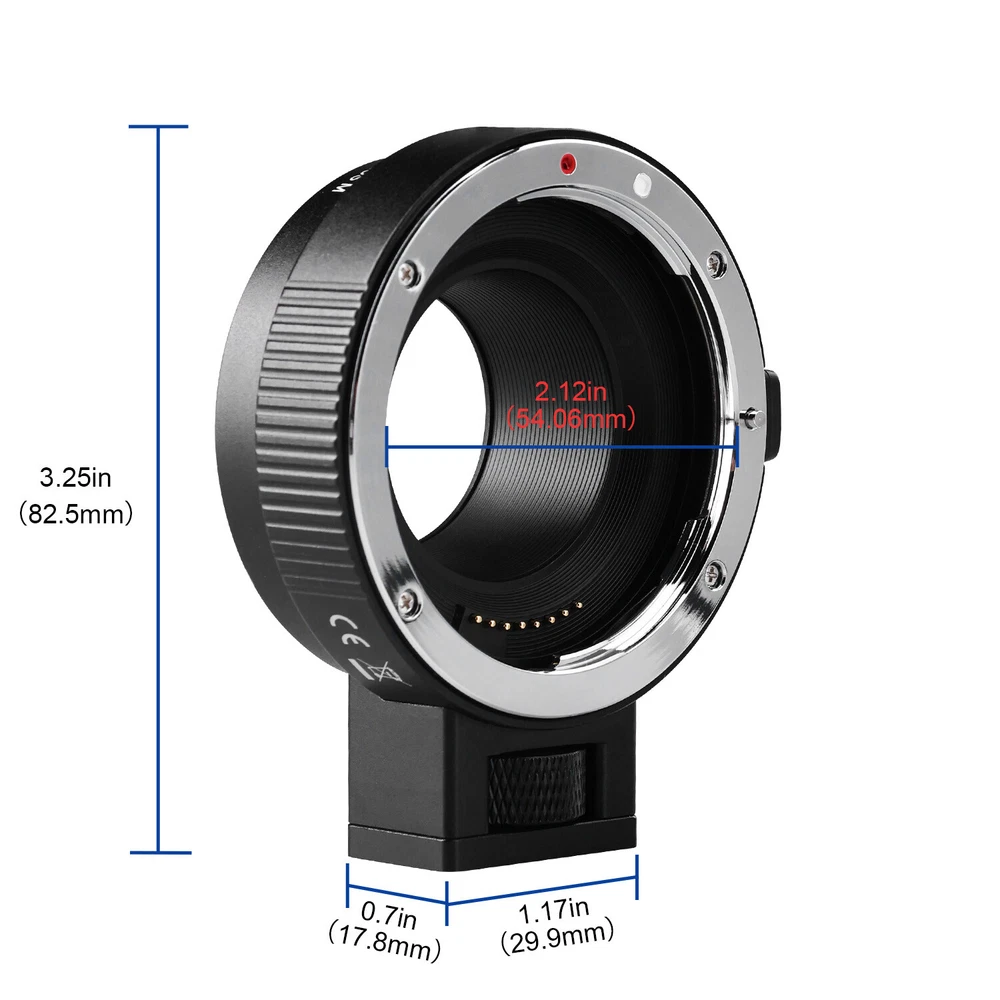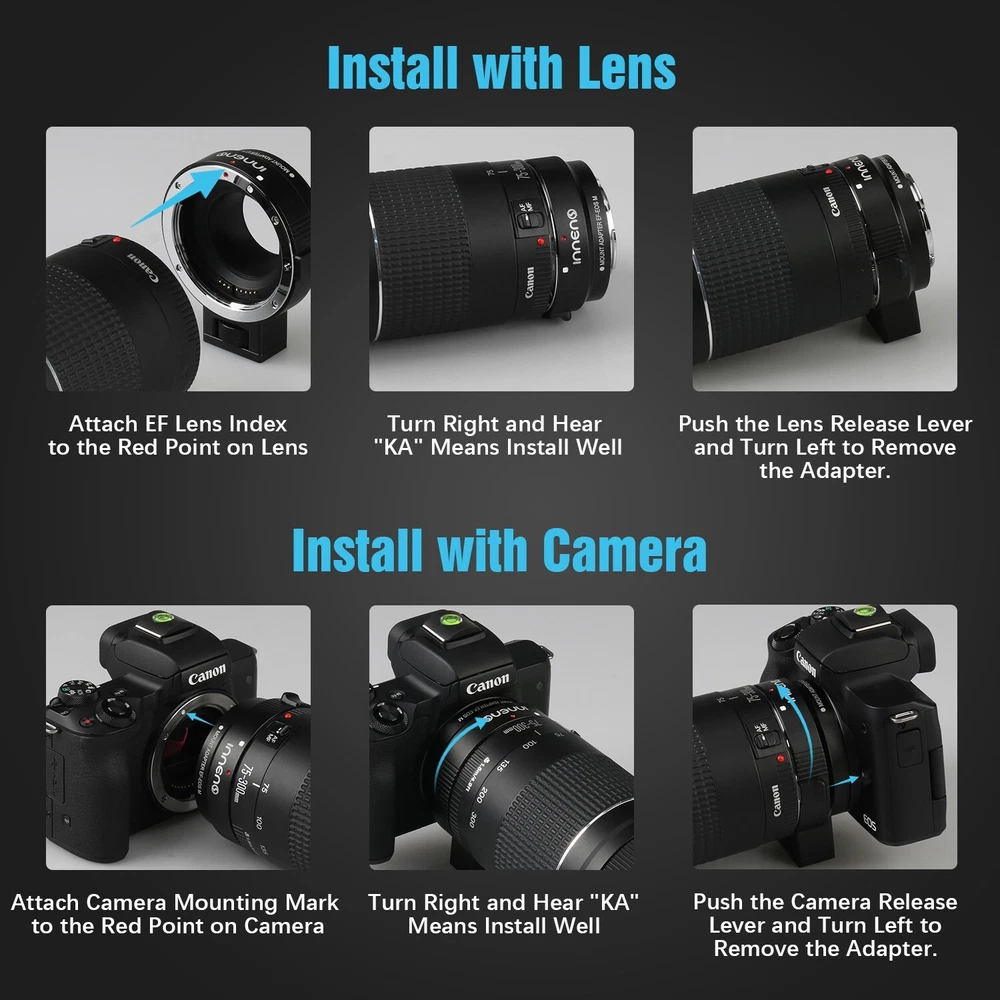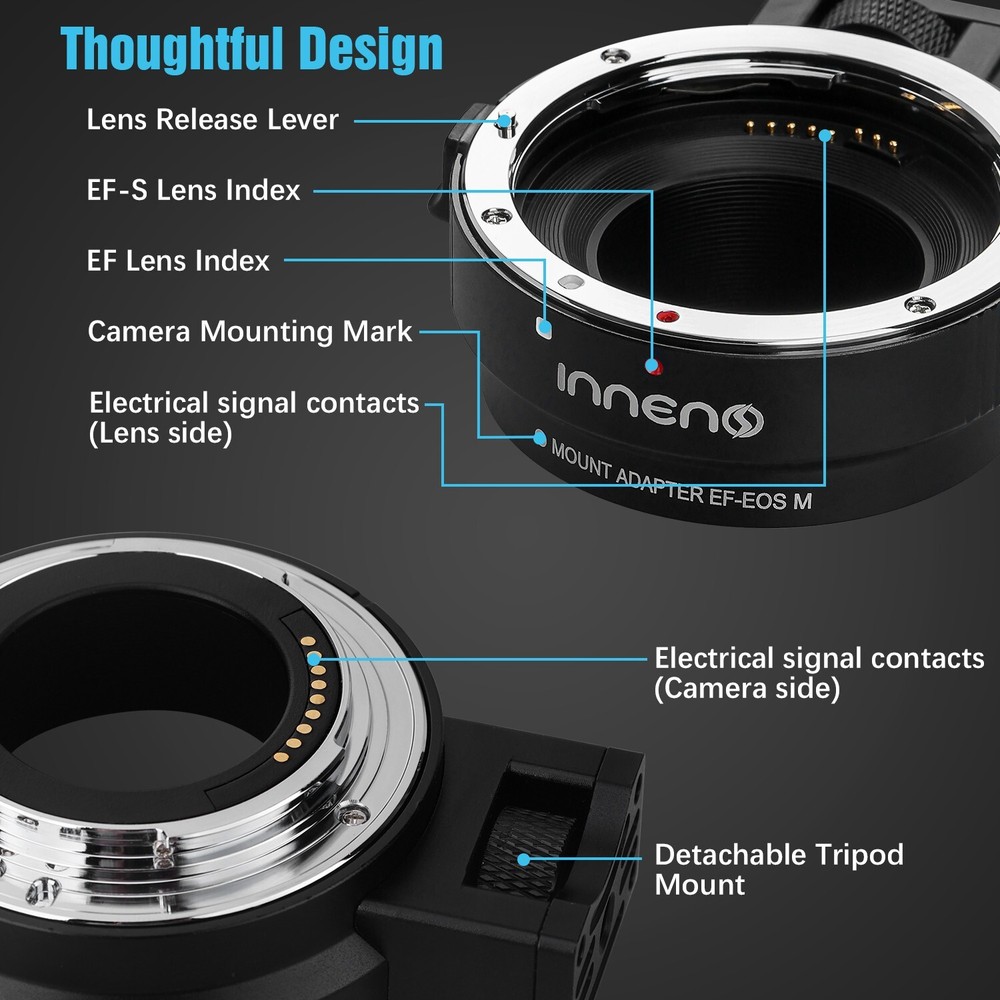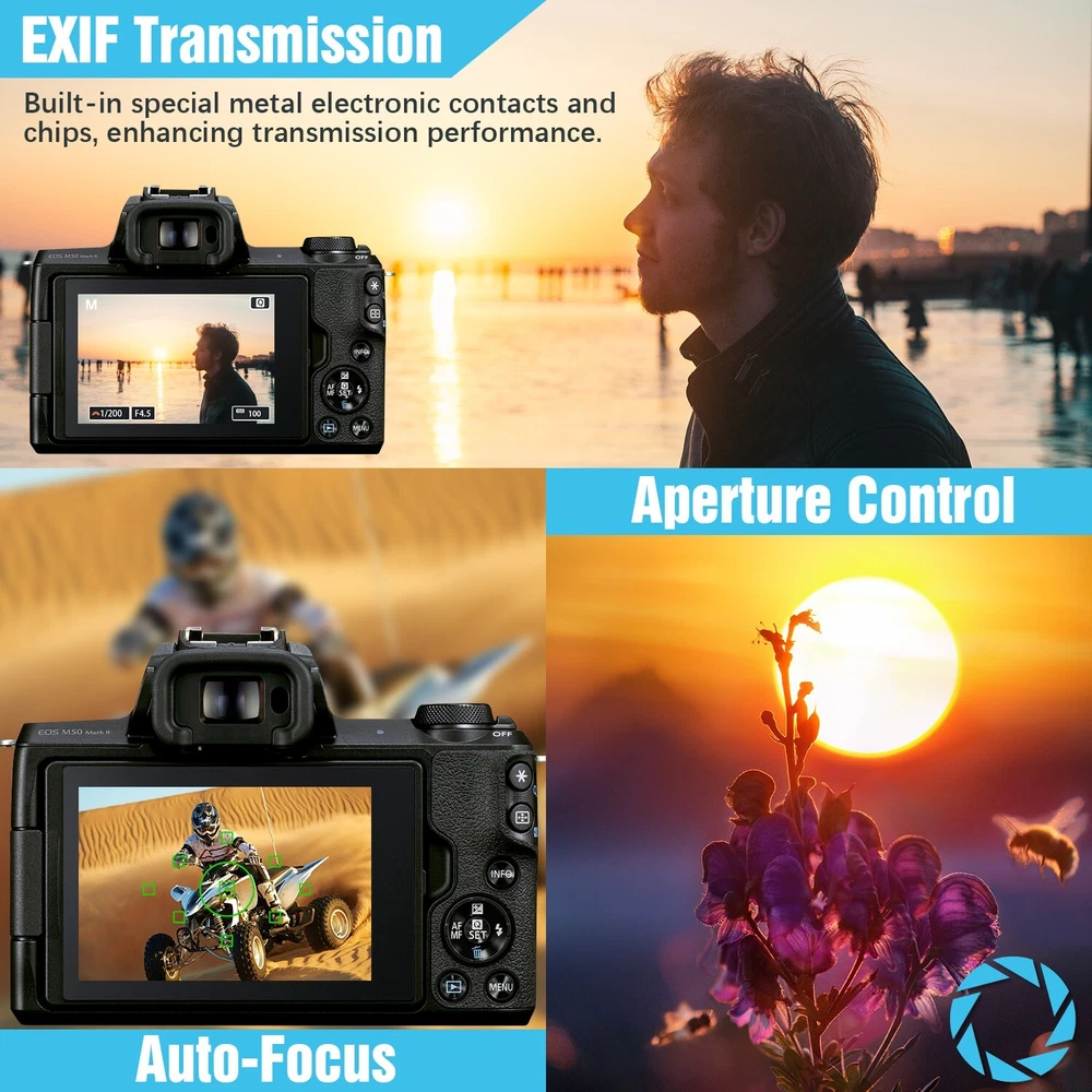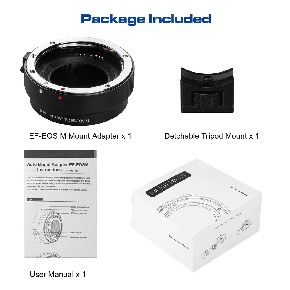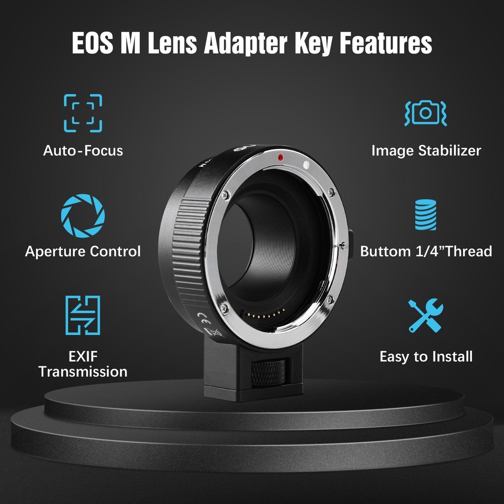EF-EOS M Auto-Focus Mount Lens Adapter for Canon Camera EOS M M2 M3 M5 M6 M10 M50 M100 M200 Feature: 100% Brand New product with High Quality! 【 Perfect Compatibility 】This auto focus EF-EOS M adapter compatible for Canon EF and EF-S lenses and EOS M series camera,such as M M2 M3 M5 M6 M6 Mark II M10 M50 M50 Mark II M100 M200. It can help you use existing lenses to try out new ones to get the shots you want, showing off your amazing creativity perfectly! 【 Auto-Focus & Aperture Control 】This mount adapter for canon EOS M built in aperture motor and an electronic contact, supports fast to focus, the EOS M seamlessly connects with the EF lens to give you a fast, smooth focus experience. Actual aperture of lens can be controlled directly from the camera side. Suit for the fixed focus and zoom lenses covering a focal length range from 8mm to 800mm. 【 EXIF Transmission 】Built-in special metal electronic contacts and chips, record photo information and shooting records, enhancing transmission performance also improve the quality of signal transmission. 【 Image Stabilizer to Enhane Shooting Efficiency 】Built-in image stabilizer's anti-shake technology, effectively eliminating image ghosting and blurring problems brought about by sports shooting or when held in hand.【Note: Please set your camera APS-C Size Capture to "off" if you get your lenses to full frame function.】 【 Thoughtful Design & Easy to Install 】Lens mounting mark on the adapter,simple and quick installation for even newbie. With a removable 1/4 screws at the bottom, can be conneted to on tripod without tools, also you can remove it. Package Included 1x Lens Adapter Ring 1x Detachable Base 1x Manual 1x Small L-shaped Wrench On Mar 12, 2025 at 19:53:04 PDT, seller added the following information: On Apr 3, 2025 at 06:21:55 PDT, seller added the following information: