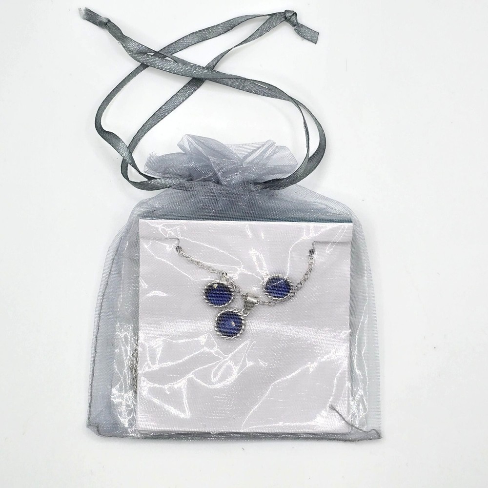 This elegant silver tone necklace and earring set features a striking man-made blue sapphire gemstone design. Thoughtfully packaged in an organza bag, ideal for gifting. • Blue gemstone in pendant and studs • Chain with secure clasp closure • Comes in a sheer organza gift bag • Lightweight and easy to wear Features: • Man-Made Sapphire Gemstones, Ready for Gift Giving Size: Womens 18" Condition: New With Tags NWT Gift Bag Included Please review all descriptions and photos closely before purchasing, thank you! Smoke Free Workspace Please read the description for further details and measurements, Thank you!