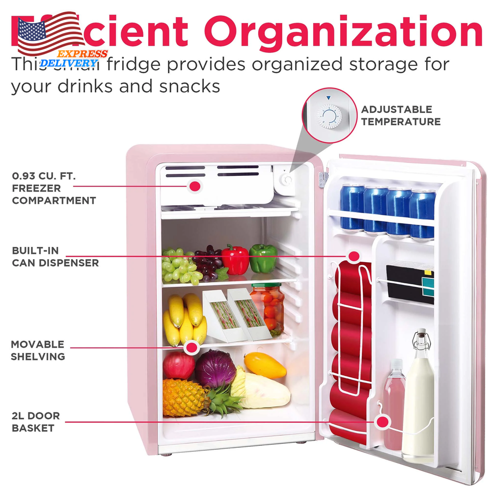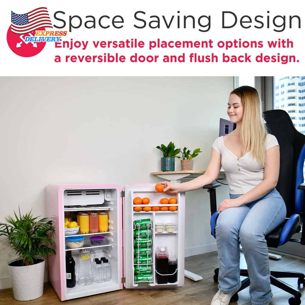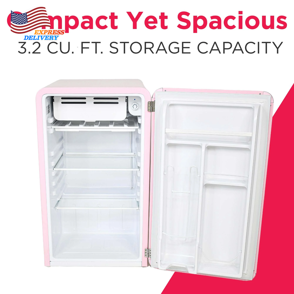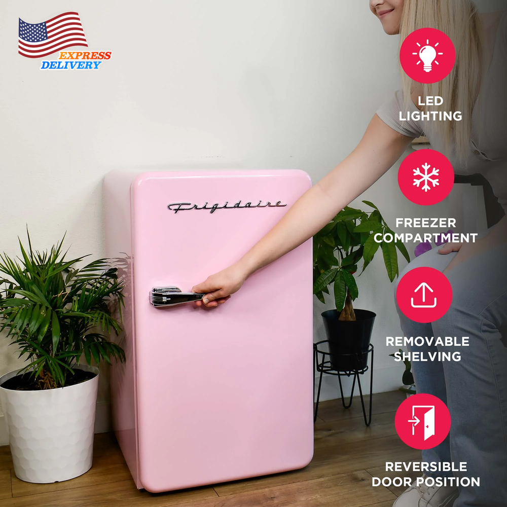 The Frigidaire 3.2 cu ft retro design refrigerator has enough room to store your favorite foods and drinks, while not taking up a lot of space. The convenient door basket on the reversible door is large enough for two-liter bottles and canned drinks. This low energy consumption refrigerator is perfect for the office or extra rooms away from the kitchen with its space saving flush back design. Ice Cube tray included allows you to make ice any time Adjustable wire shelf lets you customize your refrigerator to meet your food storage needs 2 door compartment shelves allows for easy storage of single cans and well as a 2 liter bottle 2.95 cu. ft. fresh food compartment and .25 cu. ft. freezer compartment allows for additional storage of fresh food and frozen goods Compact size allows for placement of this refrigerator virtually anywhere there is an electrical outlet Reversible door allows for many additional placement options Stainless steel look pull handle adds to the retro look Stainless steel look decorative embellishments give this refrigerator that cool sophisticated look Spacious Design: Featuring a 3.2 cu. ft. capacity, this compact fridge offers plenty of storage for bottles, cans, snacks, and more. The space-saving flush back design allows for seamless placement against walls, making it perfect for smaller spaces. Organized Storage: Equipped with 2 glass shelves and a handy 2L door basket for large bottles, this small fridge provides organized storage for your drinks and snacks, along with a built-in can dispenser. Chiller Compartment: This mini fridge includes a spacious chiller compartment complete with an ice cube tray, so you have everything you need, all in one space. Practical Style: Perfect for entertaining, this small retro refrigerator comes with an easy-open pull handle adds to the retro vibe, reminiscent of classic designs from the past. Customizable Design Options: Tailor this retro fridge to suit your space and style with the reversible door feature that offers flexible placement options. Choose from an array of assorted colors to add a personalized touch that complements your unique aesthetic.