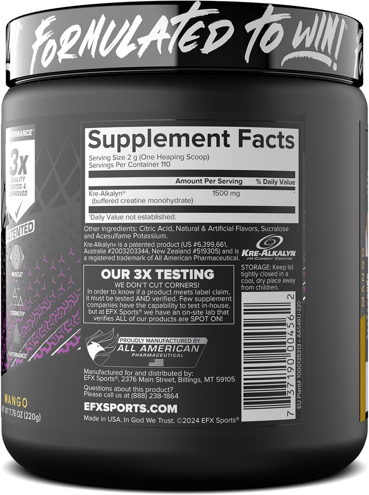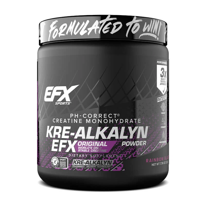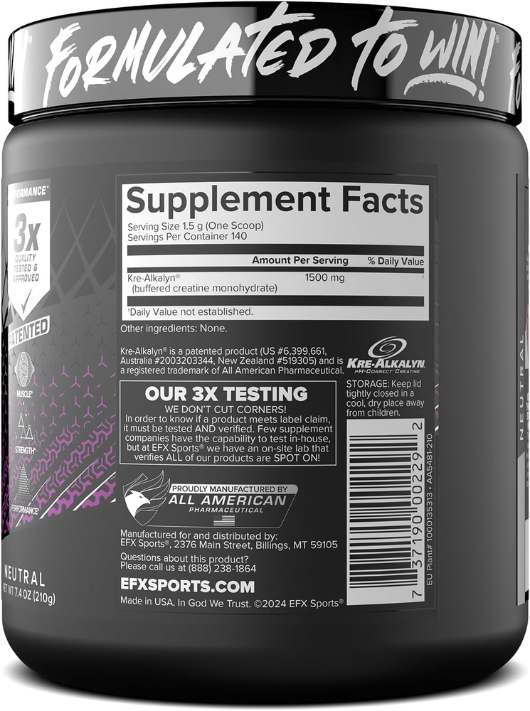➤ THE ONLY PH-CORRECT CREATINE MONOHYDRATE Traditional creatine supplements have pH levels below 7, which immediately begin converting to creatinine — a useless waste product — when mixed with a solution. (The lower the pH of the solution, the quicker the conversion.) Kre Alkalyn EFX, however, has a multi-patented pH range of 12-14, resulting in a buffered, stable creatine monohydrate. This means you only need 1.5-3 grams with no loading, no bloating, and no side effects! ➤ GAIN STRENGTH, BUILD MUSCLE & ENHANCE PERFORMANCE Creatine monohydrate is the single most studied sports supplement ever. It’s the top pre-workout and post-workout compound for athletes and bodybuilders who want to improve muscle mass, increase power, enhance performance, and accelerate muscle recovery. Kre Alkalyn EFX is 99.9% pure creatine monohydrate—science-backed, clinically tested, and safe for professional athletes looking for a legal edge! ➤ CONVENIENT POWDER & SCOOP Kre Alkalyn EFX flavored and neutral powders easily mix in water or your favorite drink. We include a scoop that gives you a precise serving with no guessing. Just grab the bottle from your gym bag, scoop, mix, and get to work! ➤ PATENT-HOLDER’S ORIGINAL BRAND Kre Alkalyn EFX was invented by Dr. Jeff Golini, the exclusive formulator of EFX Sports. He developed the patented manufacturing process that produces the ONLY creatine monohydrate with a pH level of 12-14. No other creatine product can make that claim! ➤ WE MANUFACTURE OUR OWN PRODUCTS EFX Sports is part of a very small, elite group of brands that actually make their products themselves. That’s why we can unquestionably guarantee Kre Alkalyn EFX always meets label claims and is 100% banned-substance free. When you use Kre Alkalyn by EFX Sports, you have the purest, most potent creatine product available anywhere!
