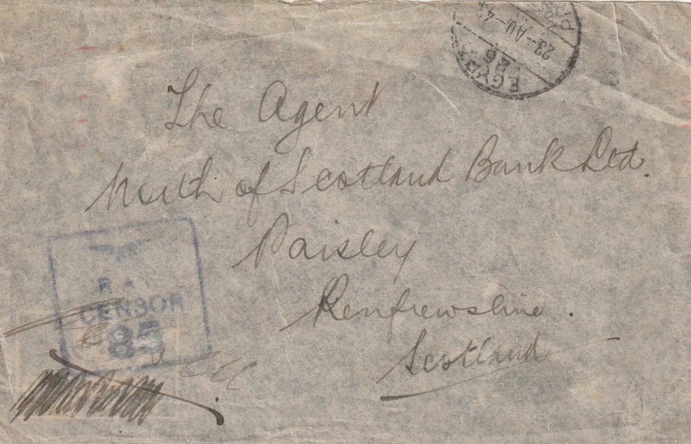 eBay Template Preview EGYPT - SCOTLAND... 1943 RAF CENSOR 85 (Type R11)... Stock ref: 50118 1943 (Aug 23)... Plain stampless envelope to Paisley cancelled Egypt /Pre Paid / 26 & with square blue RAF/Censor/85 (R12) recorded used from RAF Heliopolis from 17 Jul -19 Oct 1943, this later date extends the known use. > Mike White Postal History 1,000s of Worldwide Postal History items for sale From Napoleonic Wars to the present day Specialising in Military or Censored and Occupation mails of the World Mike White Mike White is a buyer and seller of worldwide quality postal history. Specialising in military or censored and occupation mails of the world from the Napoleonic wars to the present day. Mike has crafted an impressive and credible reputation in the industry over the past thirty plus years, visiting and participating in trade fairs across the globe. Notable exhibitions include many Federation Internationale de Philatelie and Federation Internationale Asian de Philatelie shows. He is affiliated with The Civil Censorship Study Group (CCSG), Forces Postal History Society (FPHS), Military Postal History Society (MPHS), American Philatelic Society (APS) and The China Stamp Society (CSS). Mike's passion for philately, impressive portfolio of stock, extensive industry knowledge and impeccable service keep his patrons loyal and his business thriving. In 2016 Mike began transforming his business to 100% internet and postal based. He now operates his website from home in the beautiful Gulf of Thailand. Shipping All items are shipped Worldwide from Thailand. Multiple orders from current listings will be combined in one package up to 3 Orders, after which an additional $0.25 Per Order will be charged. If purchasing multiple items, please request a combined postage invoice. Standard Shipping (Orders to $99) $4.50 Registered or Orders over $99* $7.50 DHL Courier Worldwide $40.00 All shipping methods above are available Worldwide. *Please contact us to request registered shipping and an invoice will be provided. Returns: Buyer must pay postage and return via same method sent. Disclaimer: Buyer is responsible for all taxes and/or customs charges. Payment We accept payment via PayPal and all major Credit & Debit Cards. Contact Mike Feel free to contact Mike at any time through eBay messages if you have any questions, comments or requests. All messages will be responded to at the earliest opporunity -- usually within 24 hours. © Mike White Postal History -- trading since 1977 .