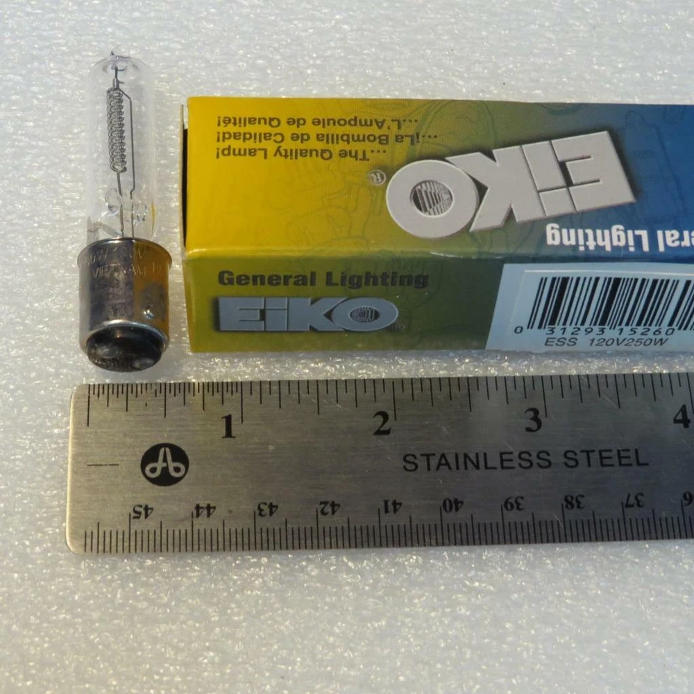 Vintage EIKO Modeling Projection Pool Lamp Made in Vietnam ( New in Box) This item is new in the box. Item has never been sold, never been used. Boxes look like they have been on the shelf 20+ years Model ESS This is a EIKO ESS - 250 Watts - 120 Volts. Modeling Lamp. It has an average life span on 2000 Hours. This item has been in stock in an Electronics Parts store too long and must be sold. It is new in the box. This is a non-returnable lamp which is standard in the industry. If it does not work as brand new we will send a return label and inspect the bulb. If it has never been on it's easy to tell. If the bulb has flashed from too much voltage or if the element has melted from going past it's life span this is not returnable for refund or exchange. EIKO ESS 120V 250W Modeling Pool Lamp Bulb AVG Life 2000Hrs Made in Vietnam EIKO ESS 120V 250W Modeling Pool Lamp Bulb AVG Life 2000Hrs Made in Vietnam Click images to enlarge Description Vintage EIKO Modeling Projection Pool Lamp Made in Vietnam ( New in Box) This item is new in the box. Item has never been sold, never been used. Boxes look like they have been on the shelf 20+ years Model ESS This is a EIKO ESS - 250 Watts - 120 Volts. Modeling Lamp. It has an average life span on 2000 Hours. This item has been in stock in an Electronics Parts store too long and must be sold. It is new in the box. This is a non-returnable lamp which is standard in the industry. If it does not work as brand new we will send a return label and inspect the bulb. If it has never been on it's easy to tell. If the bulb has flashed from too much voltage or if the element has melted from going past it's life span this is not returnable for refund or exchange. Images sell! Get Supersized Images & Free Image Hosting Create your brand with Auctiva's Customizable Templates. Attention Sellers - Get Templates Image Hosting, Scheduling at Auctiva.com. Track Page Views With Auctiva's FREE Counter